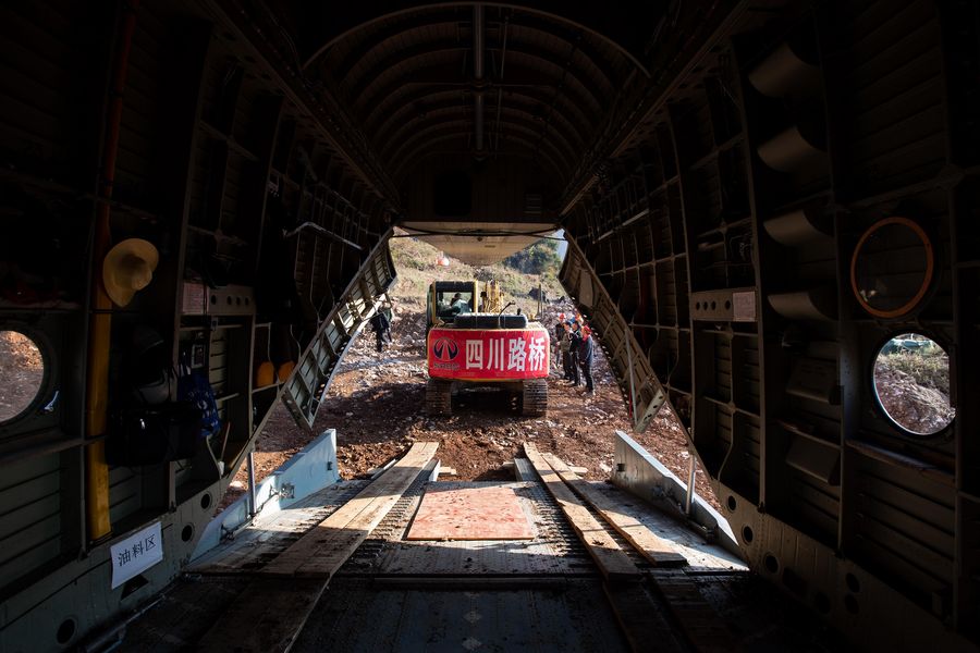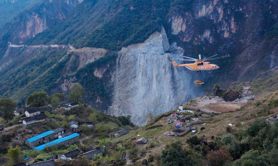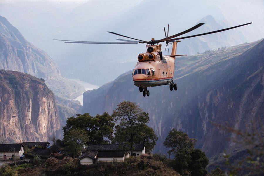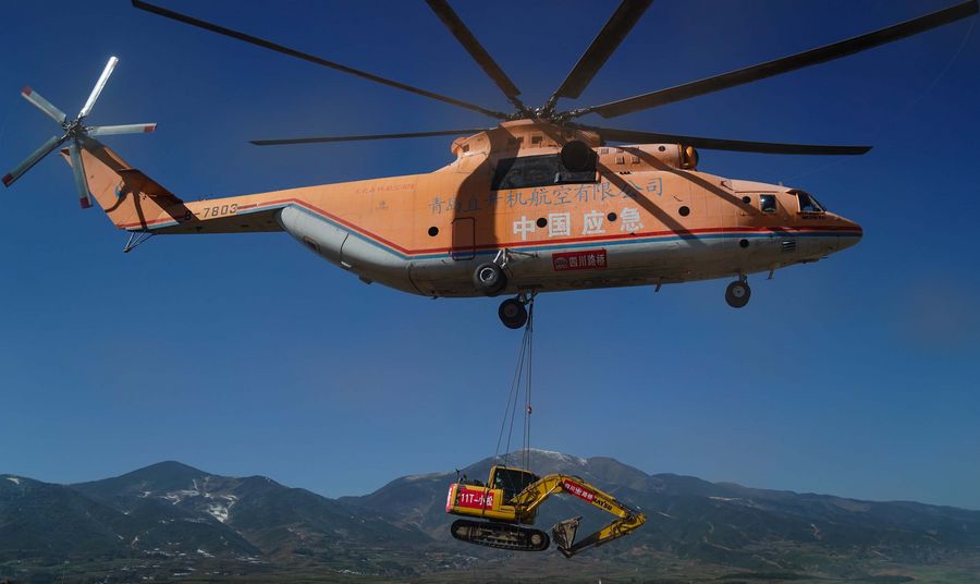 Mi-26 heavy transport helicopter loaded with an excavator arrives at Abuluoha Village in Butuo County of Liangshan Yi Autonomous Prefecture, southwest China's Sichuan Province, Dec. 5, 2019. (Xinhua/Jiang Hongjing)