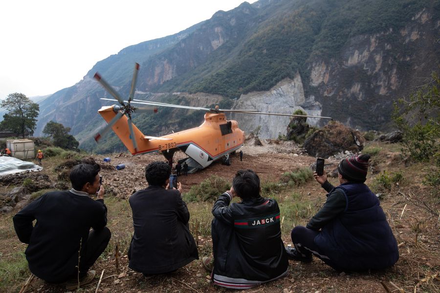Villagers watch Mi-26 heavy transport helicopter arriving at Abuluoha Village in Butuo County of Liangshan Yi Autonomous Prefecture, southwest China's Sichuan Province, Dec. 5, 2019. (Xinhua/Jiang Hongjing)