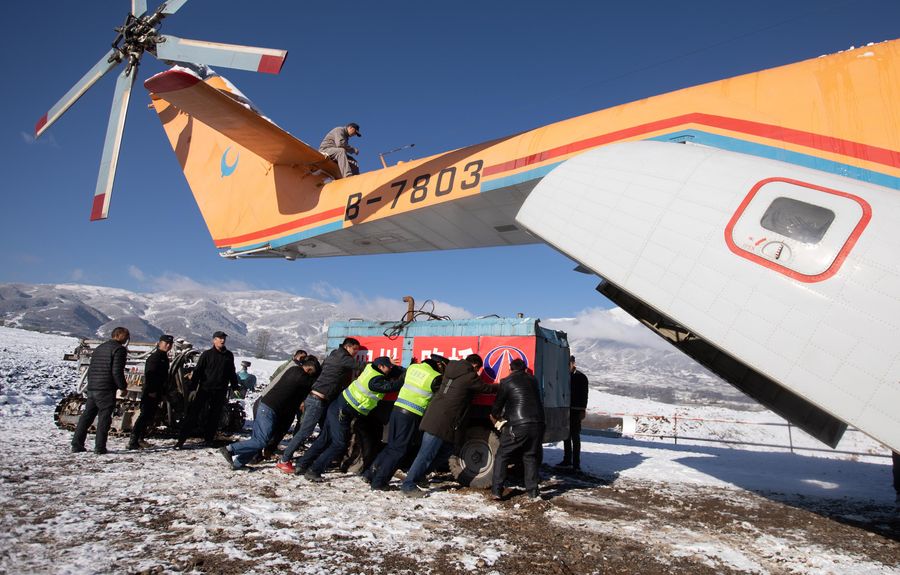 Workers load an air compressor up to the Mi-26 heavy transport helicopter in Butuo County of Liangshan Yi Autonomous Prefecture, southwest China's Sichuan Province, Dec. 5, 2019. (Xinhua/Jiang Hongjing)