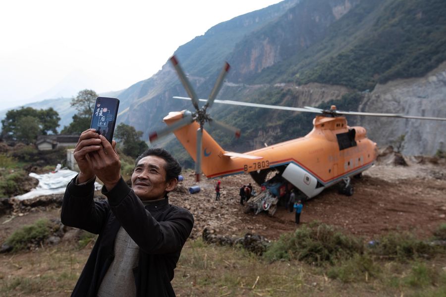 A villager takes a selfie with the Mi-26 heavy transport helicopter at Abuluoha Village in Butuo County of Liangshan Yi Autonomous Prefecture, southwest China's Sichuan Province, Dec. 5, 2019. (Xinhua/Jiang Hongjing)■