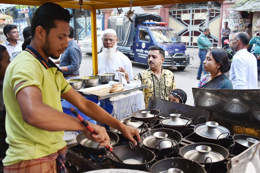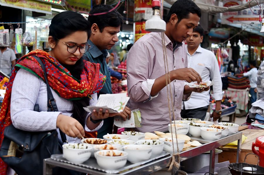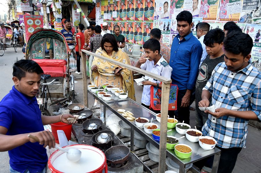People gather at a roadside stall to eat traditional winter cakes known as "Pitha" in Dhaka, Bangladesh on Dec. 7, 2019. (Xinhua/Stringer)