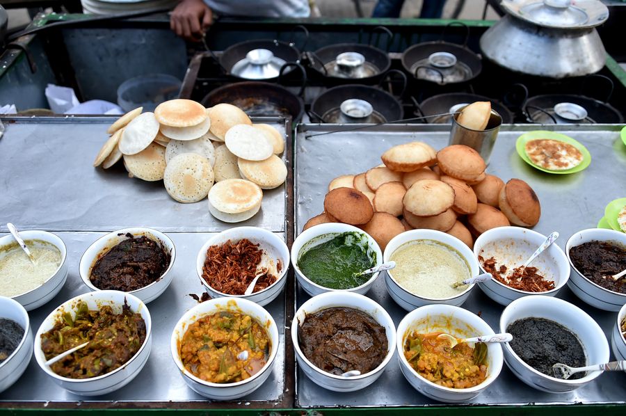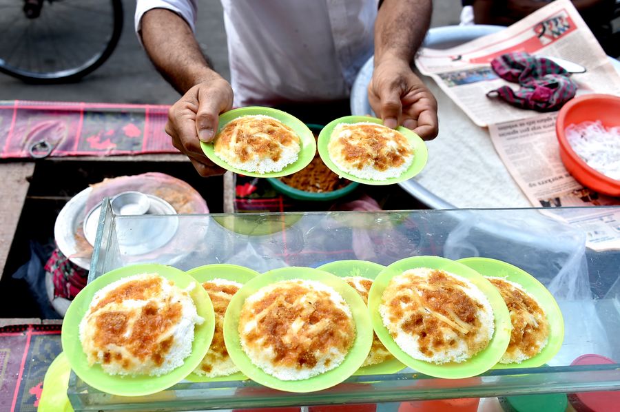 People eat traditional winter cakes known as "Pitha" at a roadside stall in Dhaka, Bangladesh on Dec. 7, 2019. (Xinhua/Stringer)
