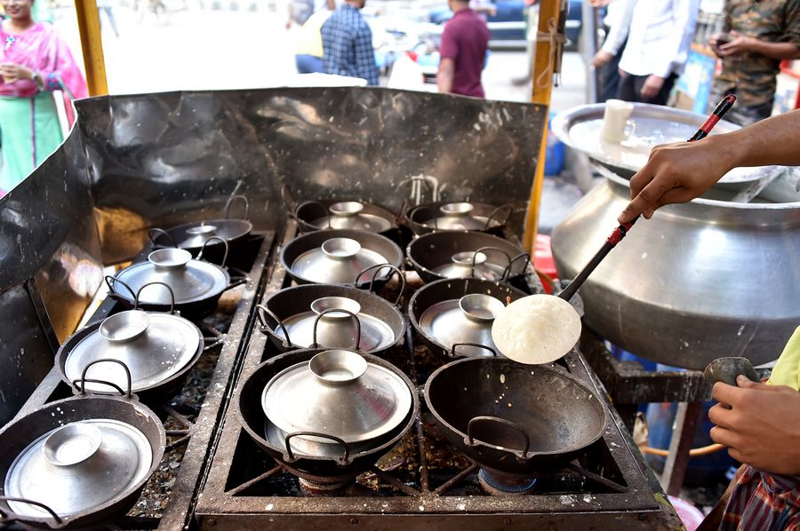 Photo taken on Dec. 7, 2019 shows iron cooking pots used to make winter cakes known as "Pitha" at a roadside stall in Dhaka, Bangladesh.(Xinhua/Stringer)