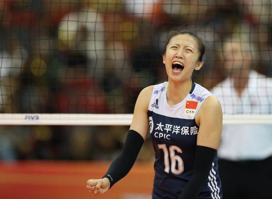 Ding Xia celebrates during the match against the United States at the 2018 Volleyball Women's World Championship in Nagoya, Japan, Oct. 14, 2018. China won 3-2. (Xinhua/Du Xiaoyi)