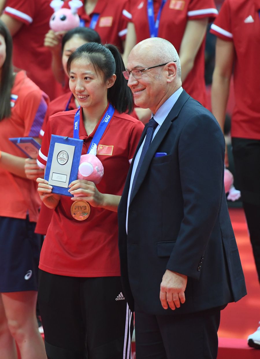 Ding Xia (L) receives the best setter award at the 2019 FIVB Women's World Cup in Osaka, Japan. (Xinhua/He Canling)