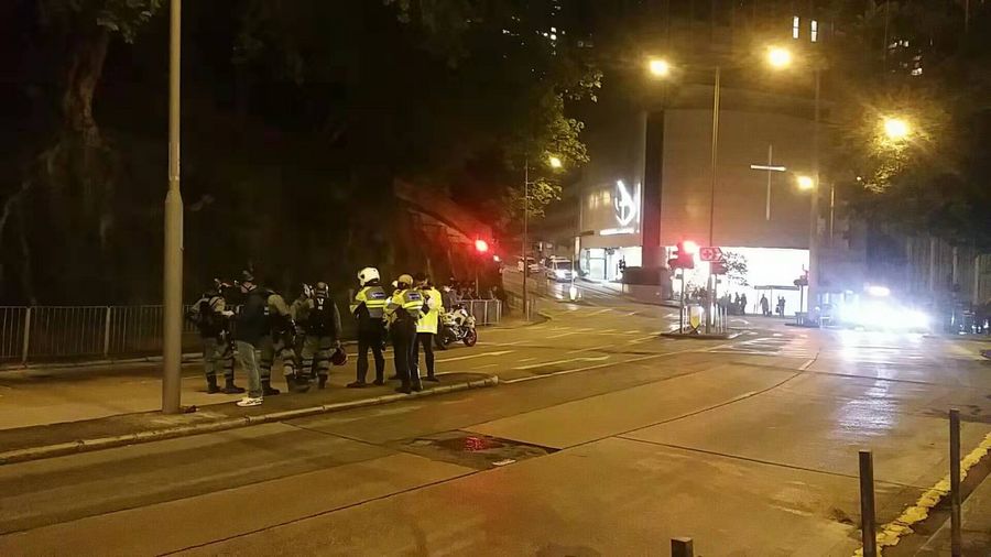Police cordon off the road near a school where two fully functional home-made bombs are found in Hong Kong, China, Dec. 9, 2019. (Xinhua)
