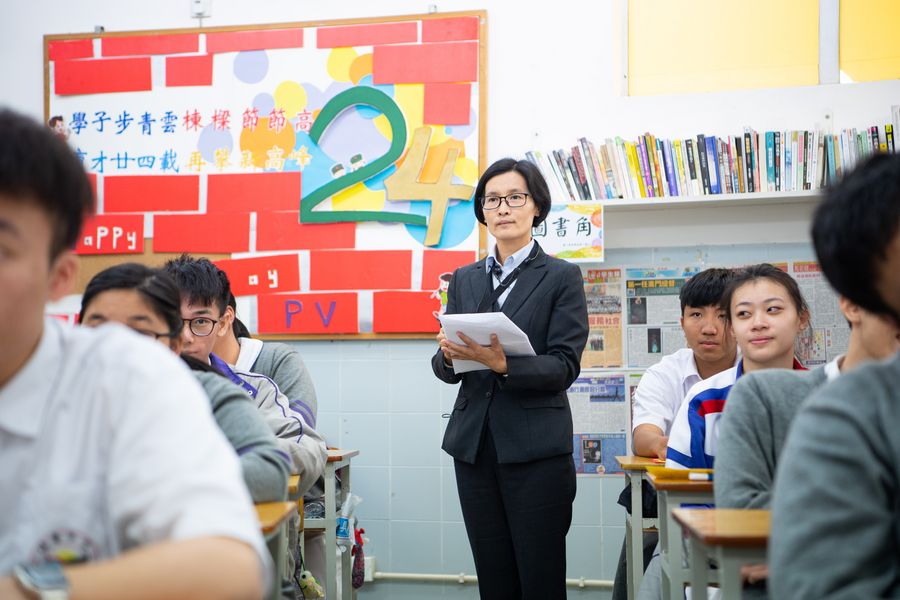 Pui va Middle School teacher Un Kam Sok, who has been working for 20 years, is seen at her office in Macao, south China, Nov. 26, 2019. (Xinhua/Cheong Kim Ka)