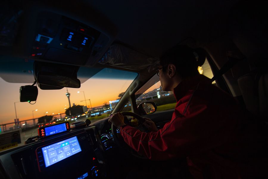 Fong Chi Kwan, a taxi driver of the Macao Radio Taxi Services Ltd. who just got into the company, poses for a photo beside his car in Macao, south China, Dec. 3, 2019. (Xinhua/Cheong Kam Ka)
