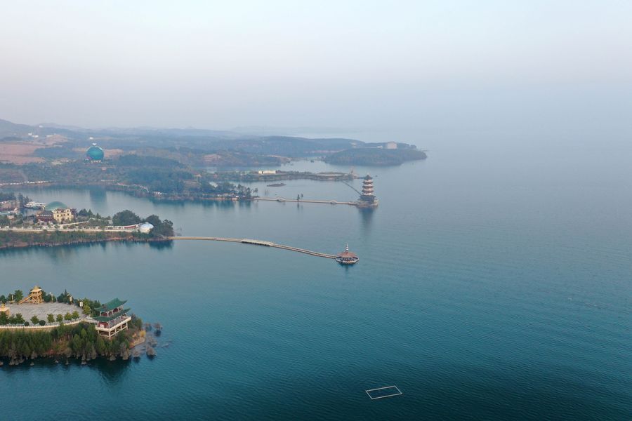 Aerial photo taken on Nov. 23, 2019 shows the scenery of Danjiangkou reservoir in Nanyang City, central China's Henan Province. Danjiangkou Reservoir is the water source of the middle route of China's south-to-north water diversion project. (Xinhua/Feng Dapeng)