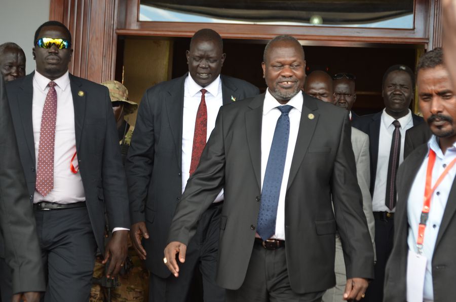 South Sudanese rebel leader Riek Machar (Front) arrives for the peace talks in Juba, capital of South Sudan, Dec. 10, 2019. (Xinhua/Denis Elamu)