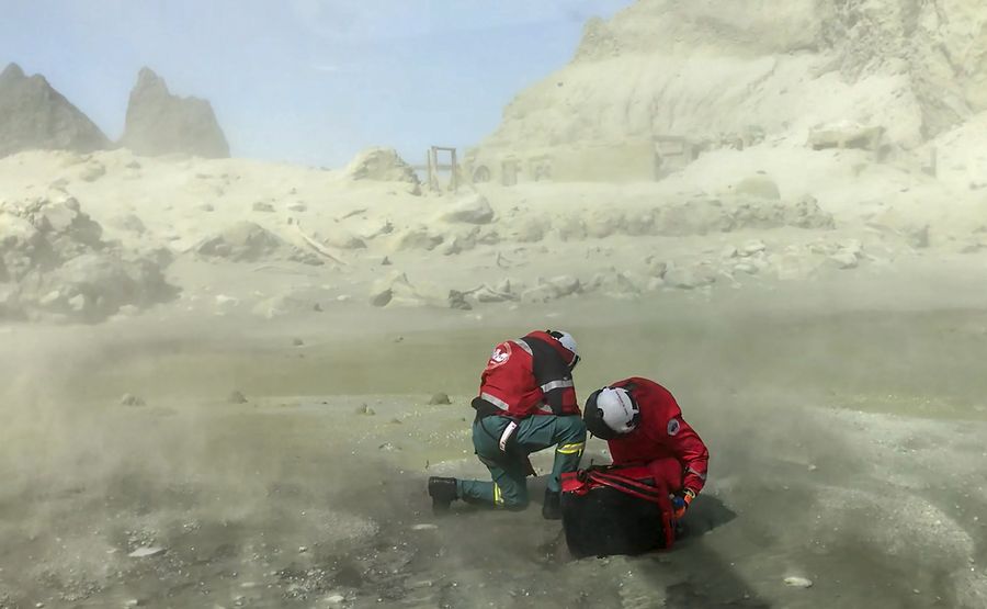 Rescuers land on the White Island after volcanic eruption in New Zealand, Dec. 9, 2019. (Auckland Helicopter Rescue Trust/Handout via Xinhua)