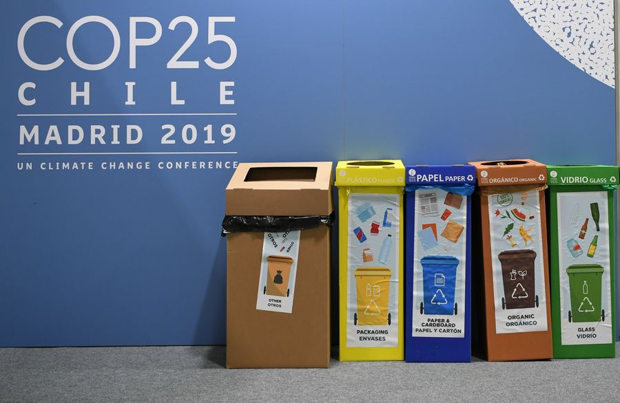 Sorting garbage cans made by paper at the United Nations Climate Change Conference COP25 in Madrid, Spain, Dec. 11, 2019. (Xinhua/Lu Yang)