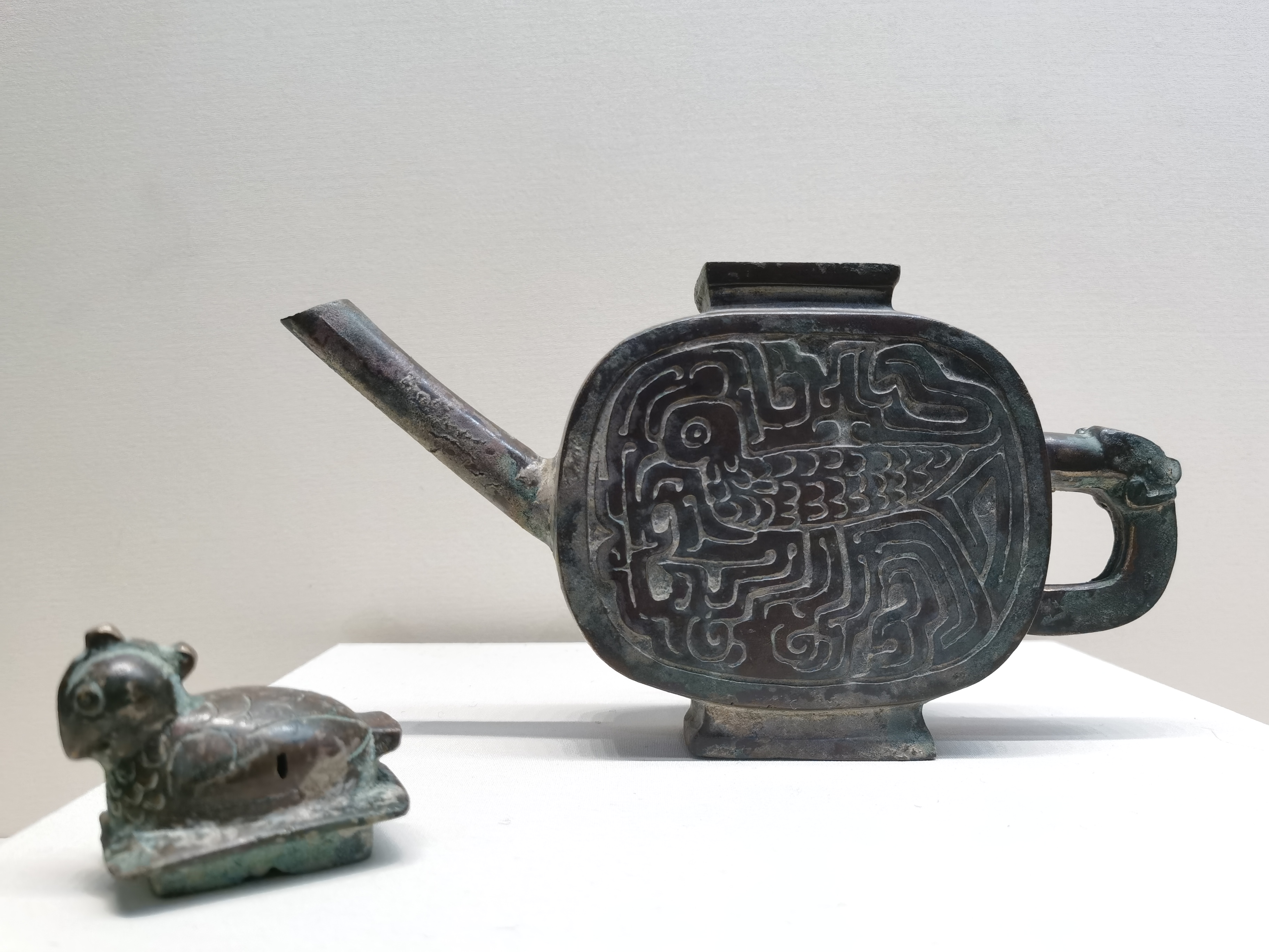 A bronze wine vessel with bird patterns displayed in the exhibition at the National Museum of China, Beijing, Dec. 13, 2019. (Xinhua/Qin Hanyuan)