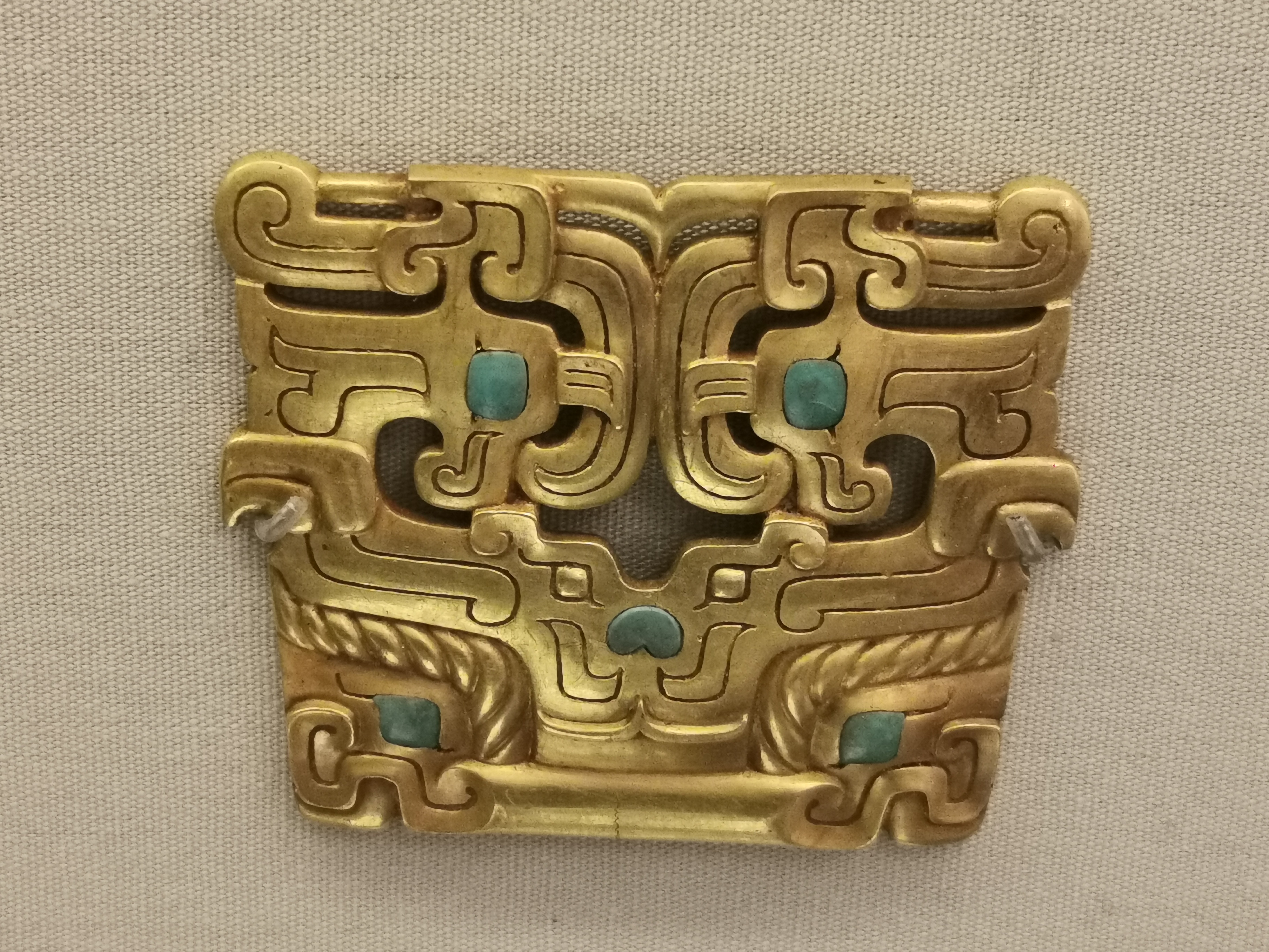 A gold ornament displayed in the exhibition, Dec. 13, 2019. (Xinhua/Yao Youming)