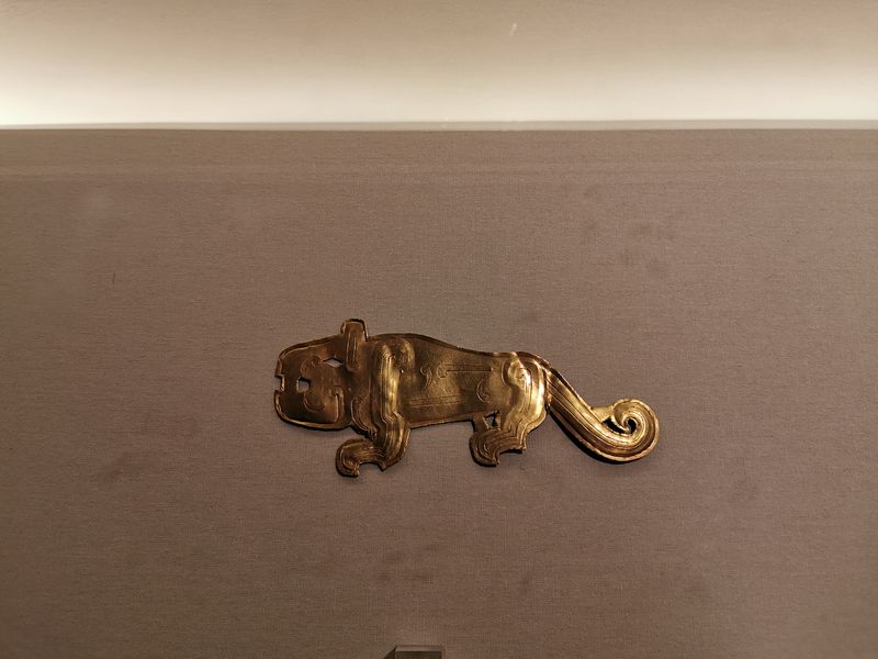 A gold ornament in the shape of a tiger displayed in the exhibition, Dec. 13, 2019. (Xinhua/Yao Youming)