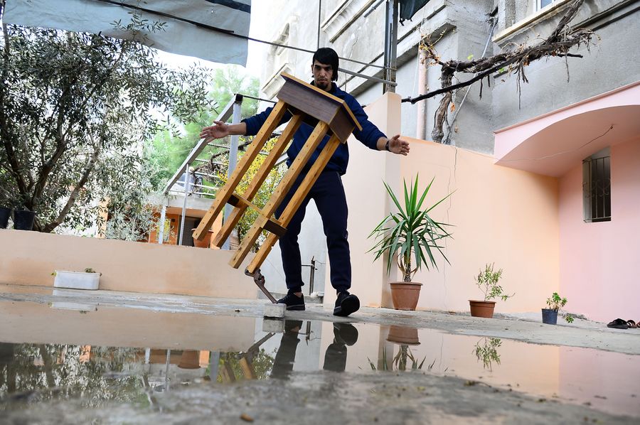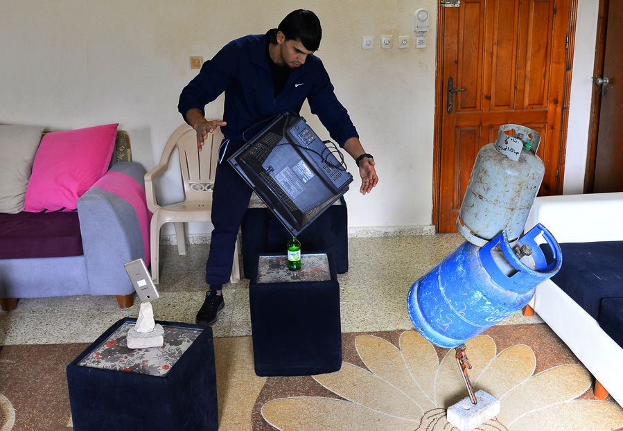 Palestinian artist Mohammed al-Shinbari practices balance art inside his house, in the northern Gaza Strip town of Beit Hanoun, Dec. 8, 2019. (Xinhua/Rizek Abdeljawad)