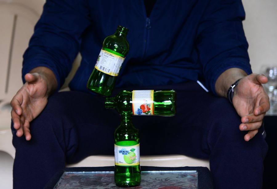 "Some people believe that I'm a magician. But others believe I defy gravity," says Mohammed al-Shinbari, a young balance artist from the Palestinian Gaza Strip, showing balanced items on top of one another in various positions without using of adhesives, supports, wires or rings.