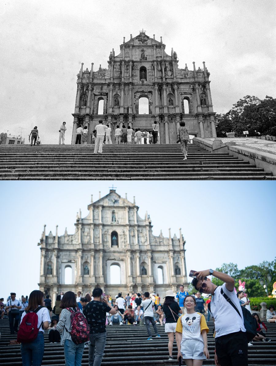 This combination photo shows tourists visiting the Ruins of St. Paul's complex in Macao, south China (top, photo by Tang Mengzong, archived on Nov. 11, 1986) and tourists visiting the same place on Oct. 8, 2019 (bottom, photo by Cheong Kam Ka).