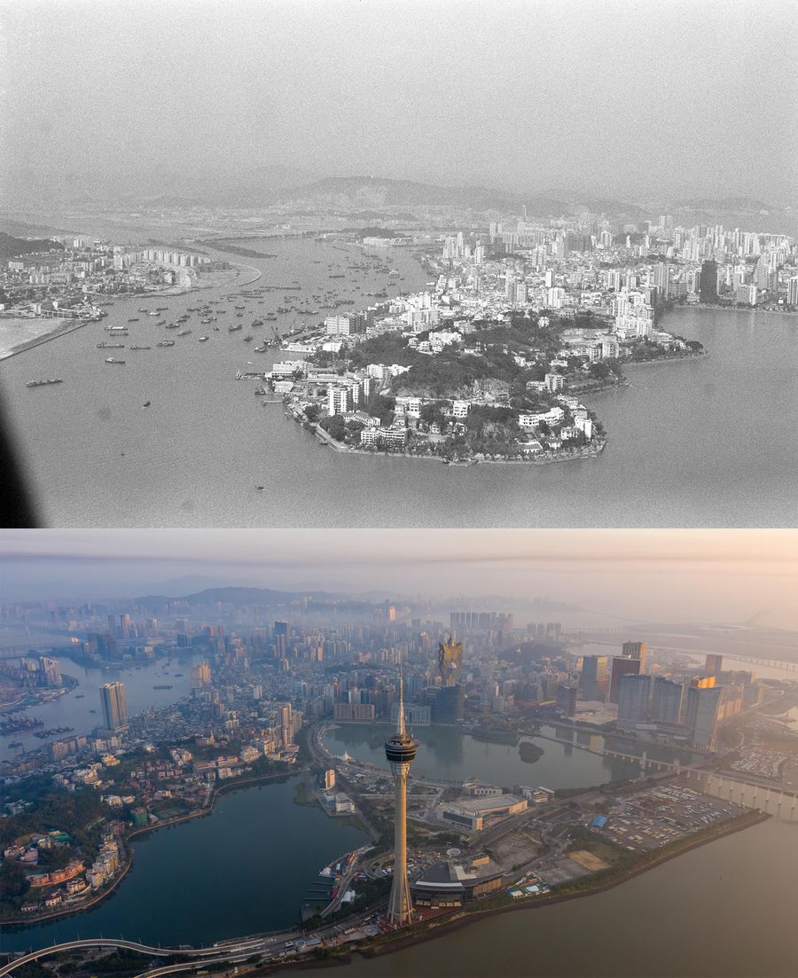 This combination photo shows an aerial view of the Macao Peninsula in south China (top, photo by Bi Yuenian, issued on Aug. 15, 1992) and an aerial view of Macao, south China on Nov. 18, 2019 (bottom, photo by Cheong Kam Ka).