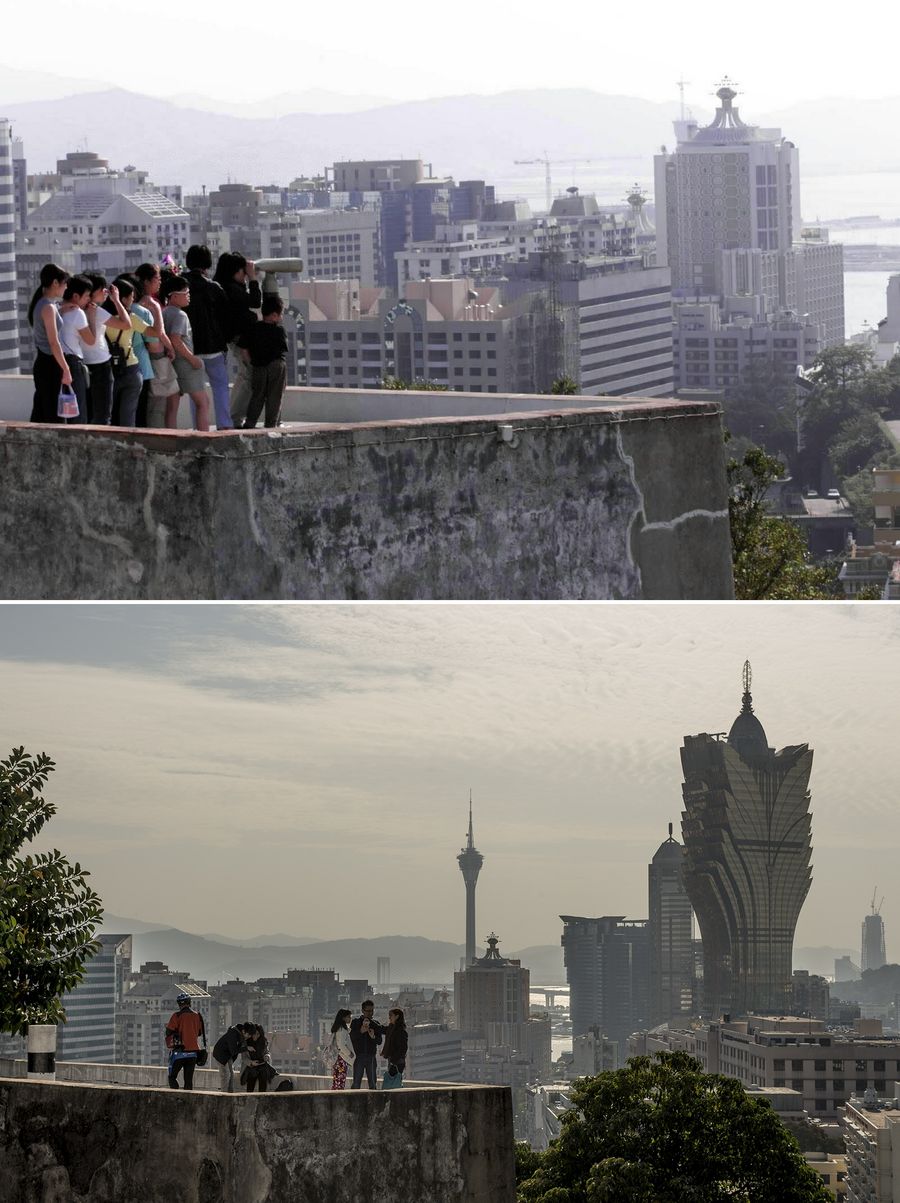 This combination photo shows tourists visiting the Colina da Guia in Macao, south China on Oct. 18, 1999 (top, photo by Wang Yuguo) and on Dec. 17, 2014 (bottom, photo by Lui Siu Wai), respectively.
