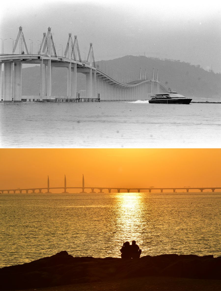 This combination photo shows a view of the Ponte de Amizade (Bridge of Friendship) in Macao, south China (top, photo by Tang Mengzong, archived on Dec. 31, 1995) and the Hong Kong-Zhuhai-Macao Bridge seen from Macao, south China on Oct. 22, 2018 (bottom, photo by Yin Bogu).