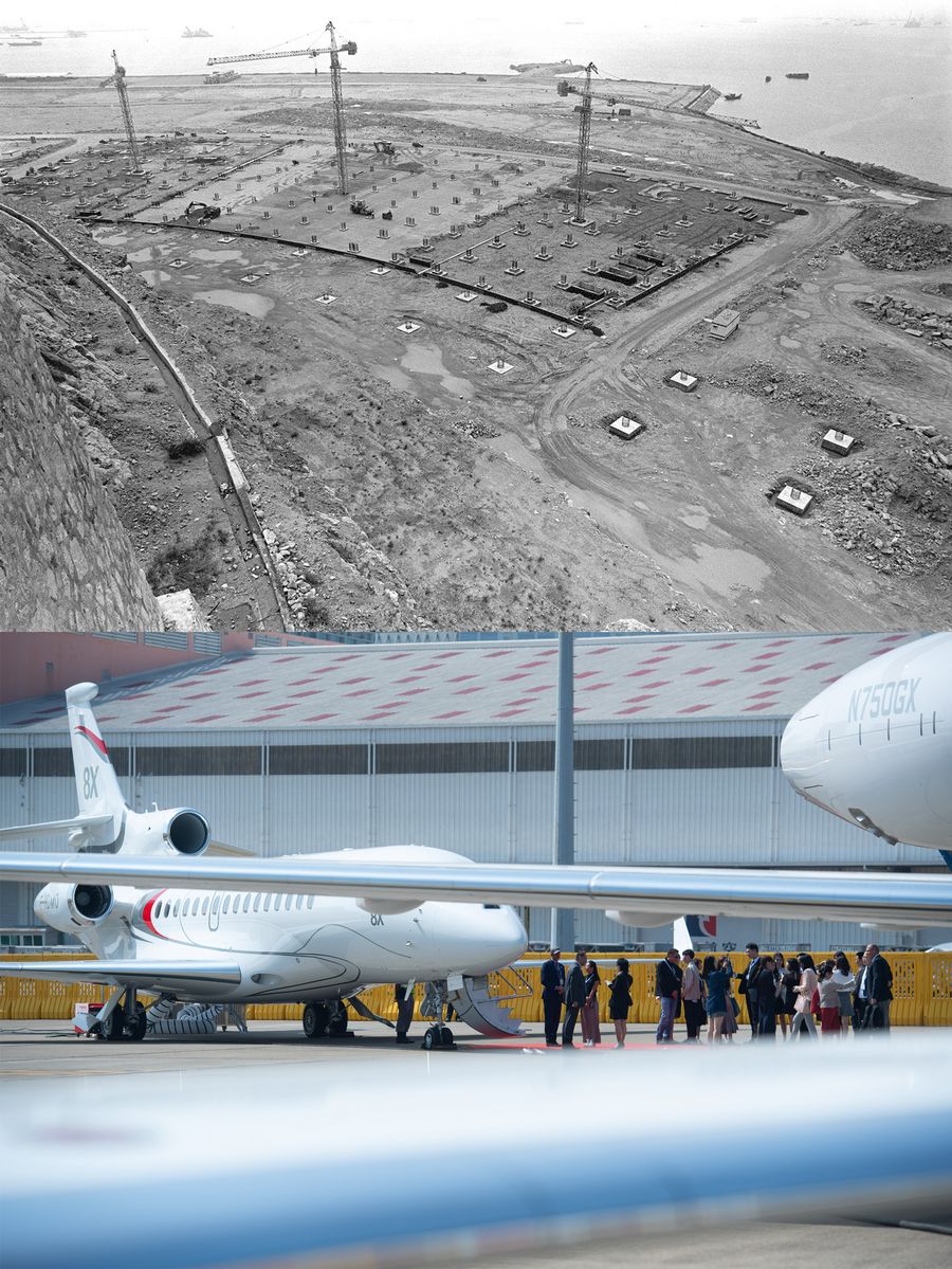 This combination photo shows the construction site of Macao International Airport (top, photo by Bi Yuenian, archived on Sept. 6, 1993) and people visiting the 2019 Macao Business Aviation Exhibition at Macao International Airport in Macao, south China on Nov. 1, 2019 (bottom, photo by Cheong Kam Ka).