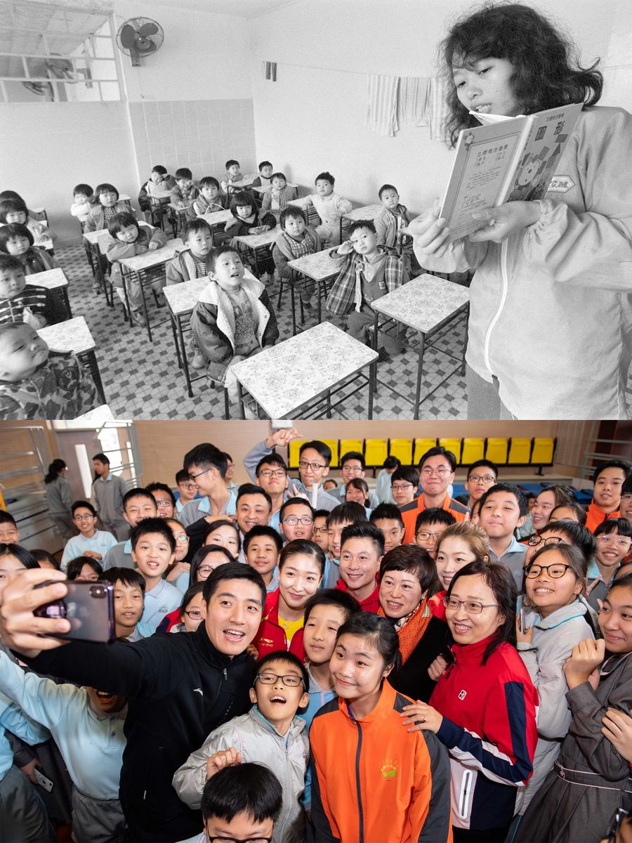 This combination photo shows children attending a class at a kindergarten in Macao, south China (top, file photo, archived on Feb. 28, 1995) and students of Premier School Affiliated to Hou Kong Middle School posing for photo with Olympic world champions Li Xiaopeng, Liu Shiwen and Wang Xin in Macao, south China on Dec. 8, 2018 (bottom, photo by Cheong Kam Ka).