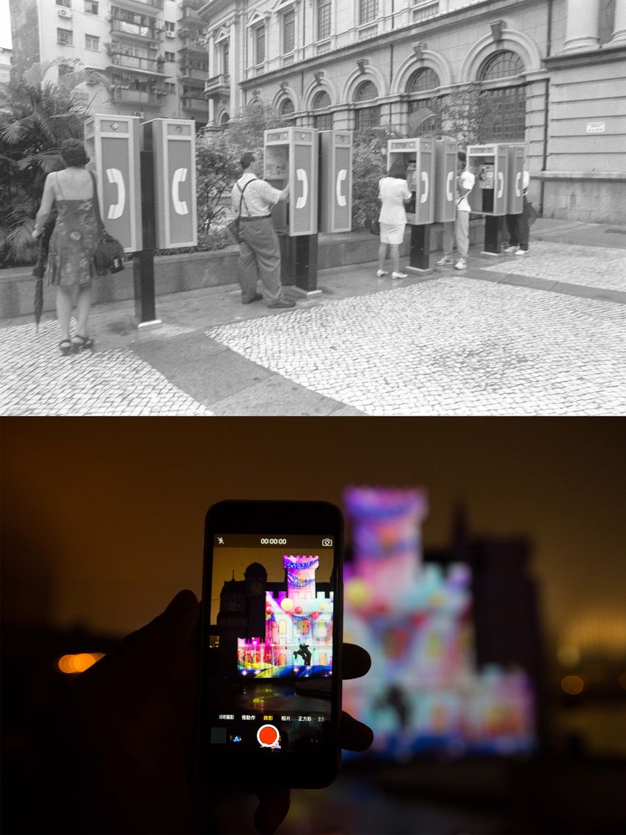This combination photo shows people using telephone booths in Macao (top, photo by Bi Yuenian, archived on Sept. 2, 1994) and a local resident recording videos of a light installation show with a smartphone in Macao, south China on Feb. 12, 2016 (bottom, photo by Cheong Kam Ka).■