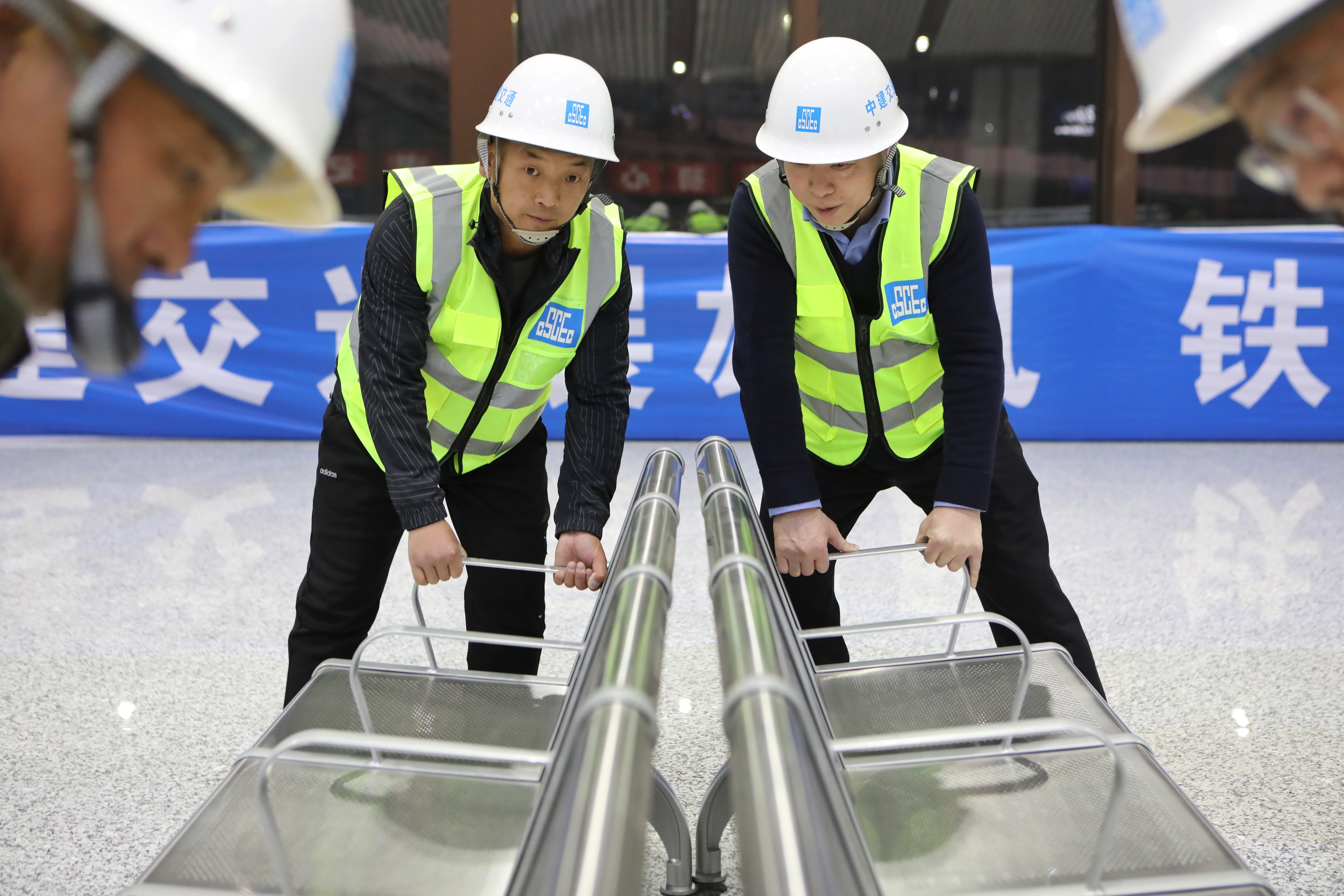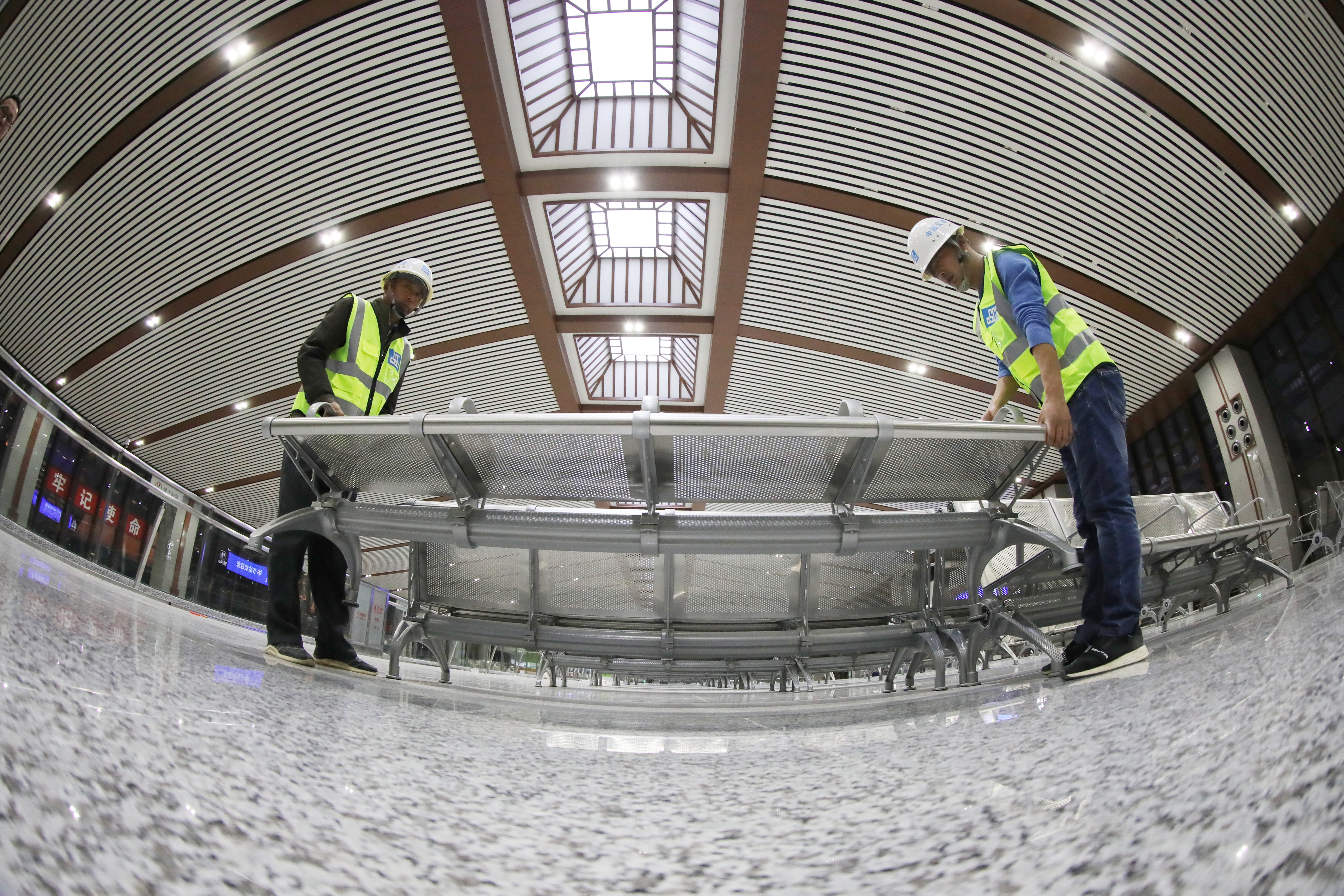 Workers adjust a chair in Bijie Station of Chengdu-Guiyang railway in southwest China's Guizhou Province, Dec. 15, 2019. (Xinhua/Ou Dongqu)