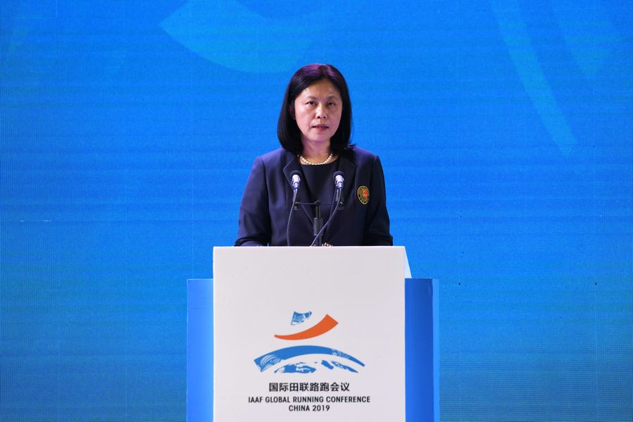Vice President of Chinese Athletic Association Wang Nan speaks during the IAAF Global Running Conference China 2019 in Lanzhou, northwest China's Gansu Province, May 31, 2019. (Xinhua/Fan Peishen)