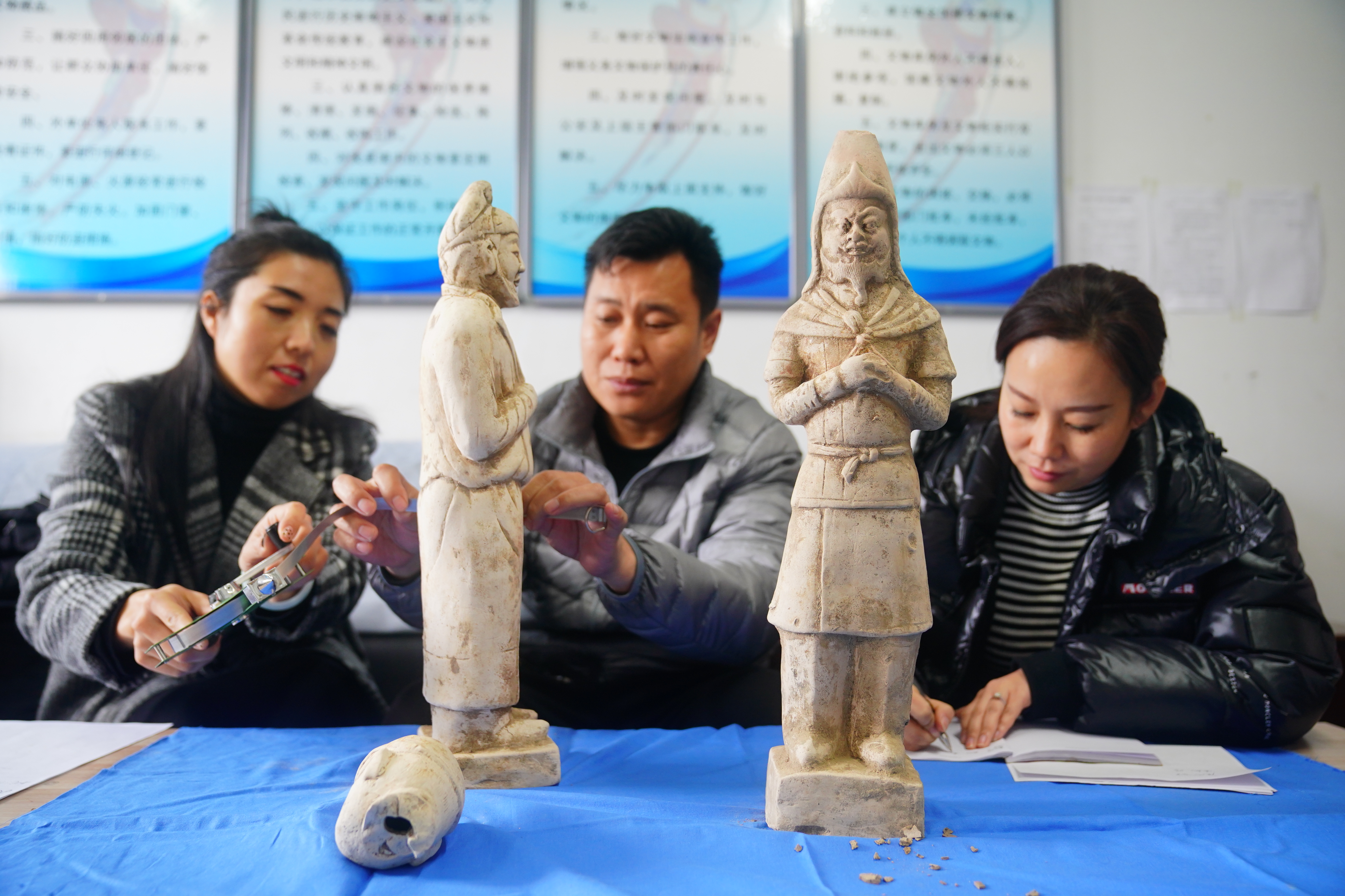Staff at the local cultural relics protection department in Nanhe County, N China, are studying the small sculptures discovered in the area, Dec. 17, 2019. (Xinhua/Du Yifang)
