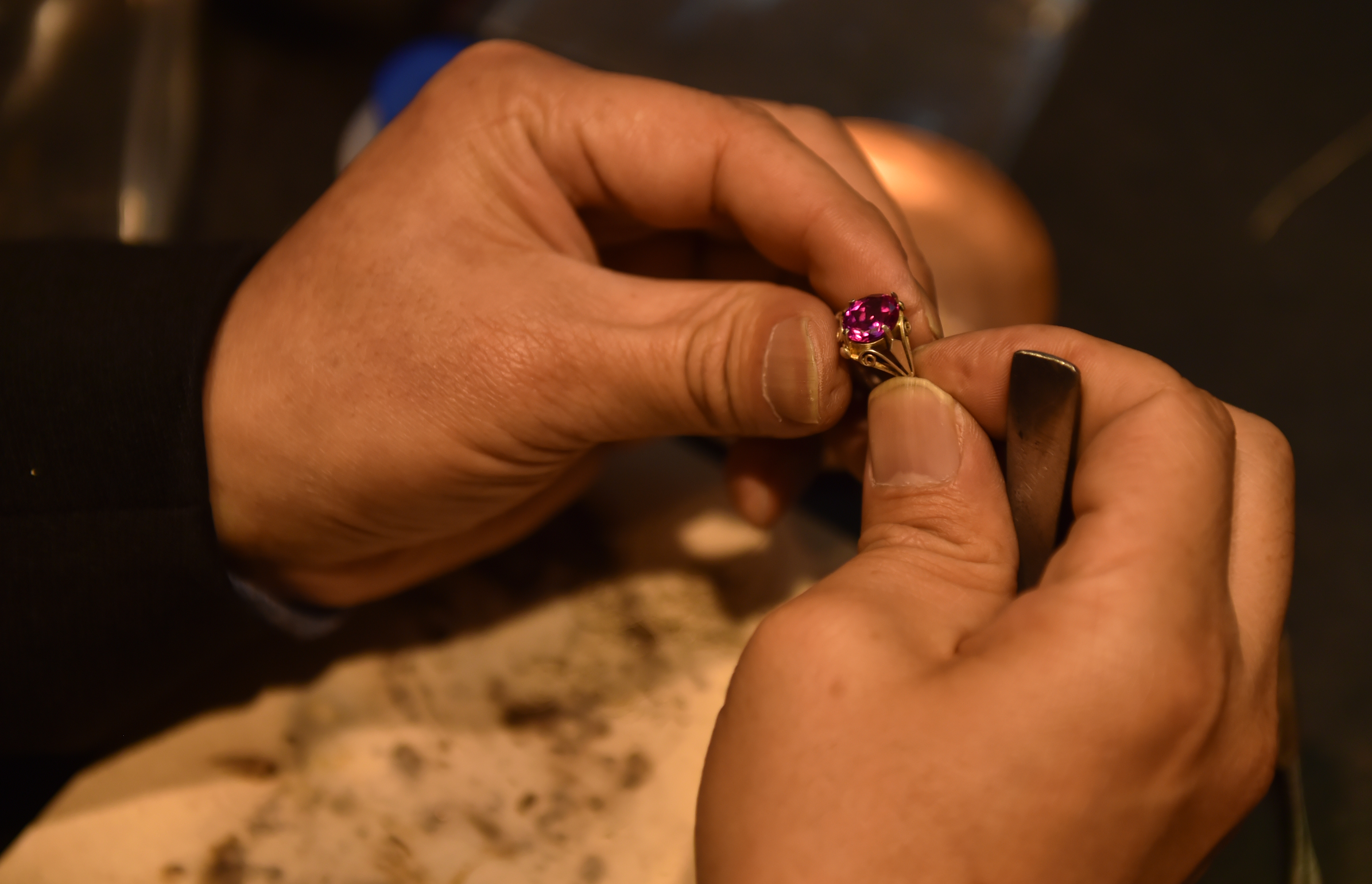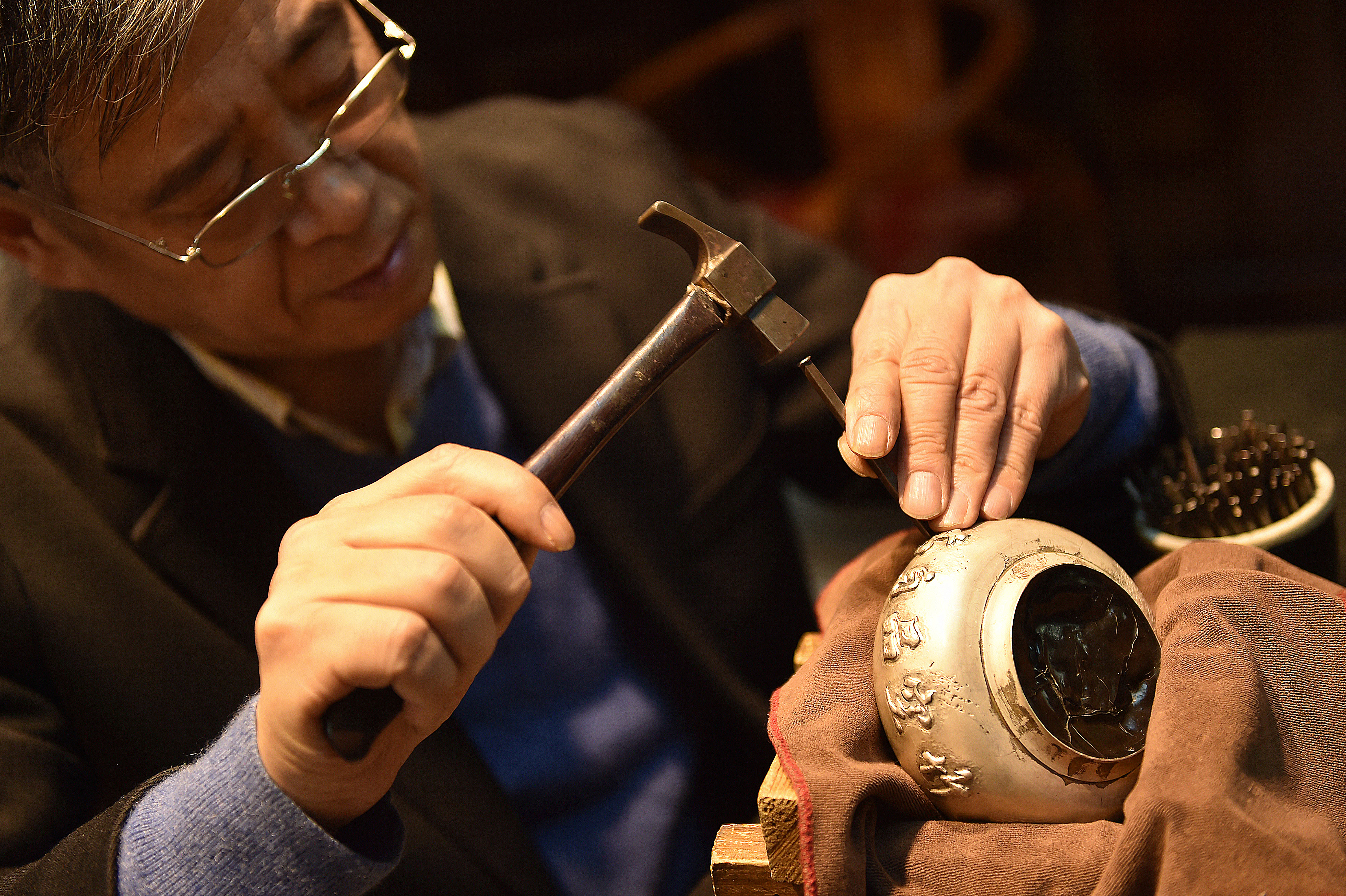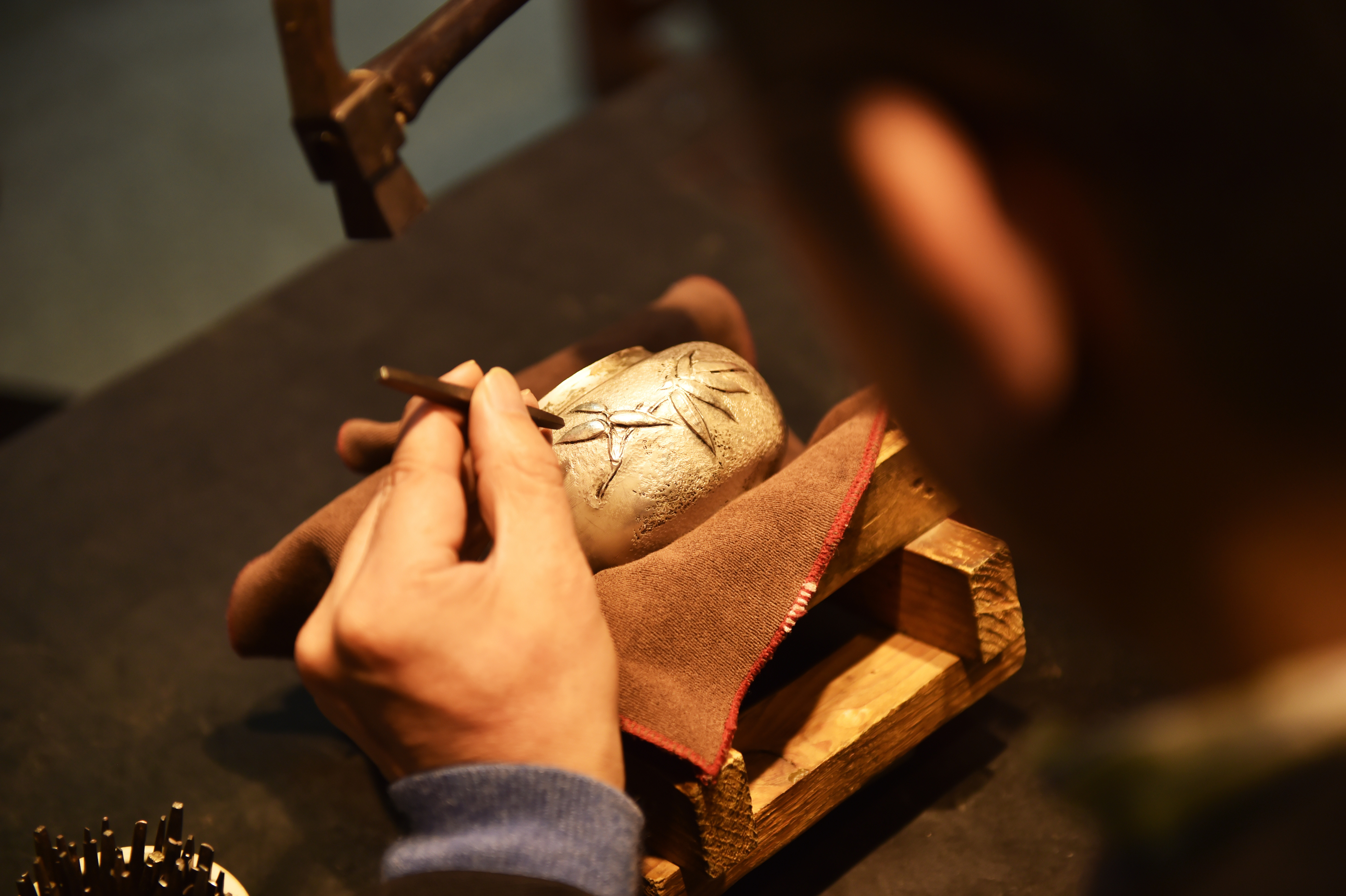 Dong Ruijing engraves bamboo leaves patterns on a piece of filigree inlay silver artwork in Beijing, capital of China, Dec. 17, 2019. (Xinhua/Chen Zhonghao)