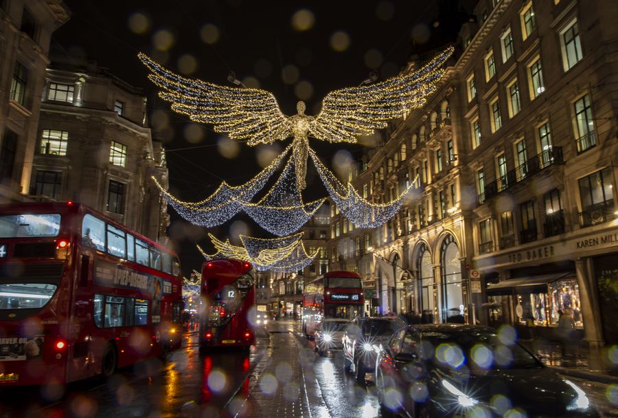 Christmas lights are seen on Regent Street in London, Britain on Dec. 18, 2019. (Xinhua/Han Yan)