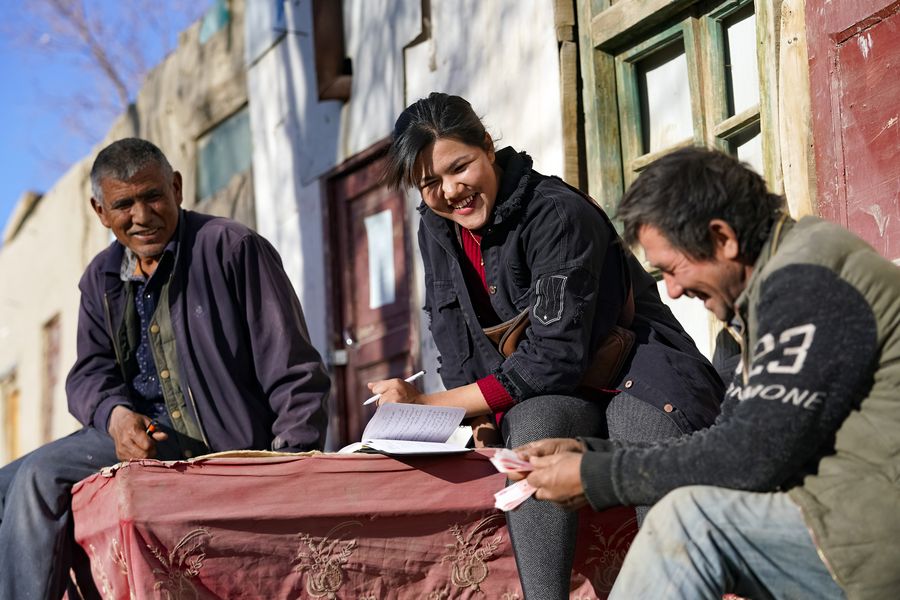 Kurbanhan Matrozi (C) settles accounts with a sheep breeding cooperation in Darya Boyi Township, Yutian County of northwest China's Xinjiang Uygur Autonomous Region, Nov. 13, 2019. (Xinhua/Shen Bohan)