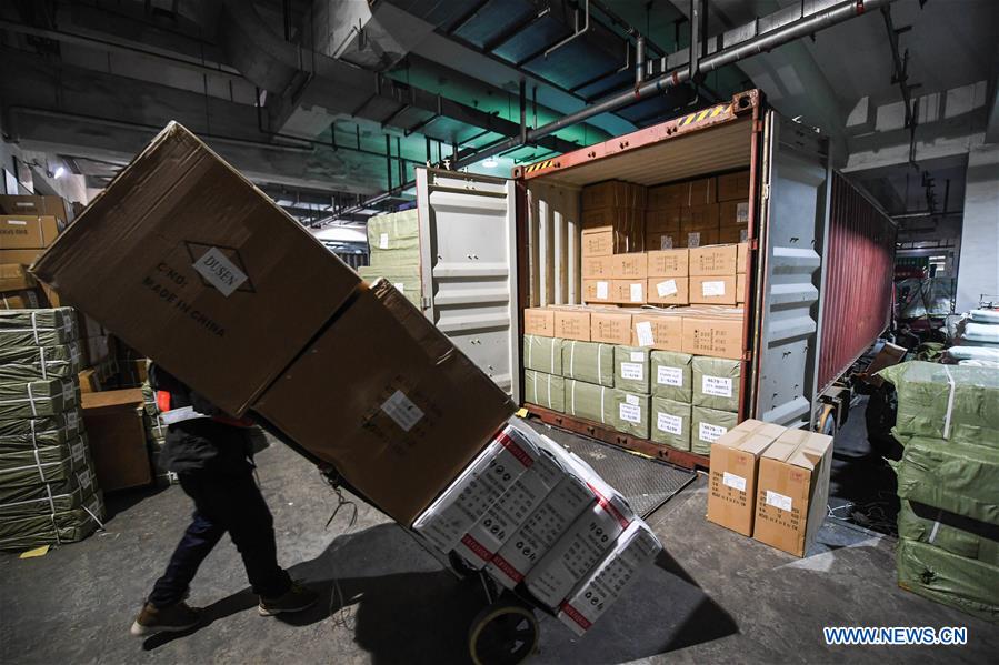 A worker of an import and export company loads the commodities onto a car for exporting to countries in East Europe at the warehouse of the Yiwu Port in Yiwu City, east China's Zhejiang Province, Dec. 20, 2019. According to the statistics from Yiwu customs, the total import and export value of Yiwu City from January to November of 2019 was 265.76 billion yuan (about 37.93 billion U.S. dollars), a 12.0 percent increase over the same period last year, which has exceeded the total import and export value of 2018. The value of import and export from January to November of 2019 totaled 8.78 billion yuan (about 1.25 billion U.S. dollars) and 256.98 billion yuan (about 36.67 billion U.S. dollars) respectively, achieving an increase of 168.1 percent and 9.8 percent respectively than the same period last year. (Xinhua/Xu Yu)