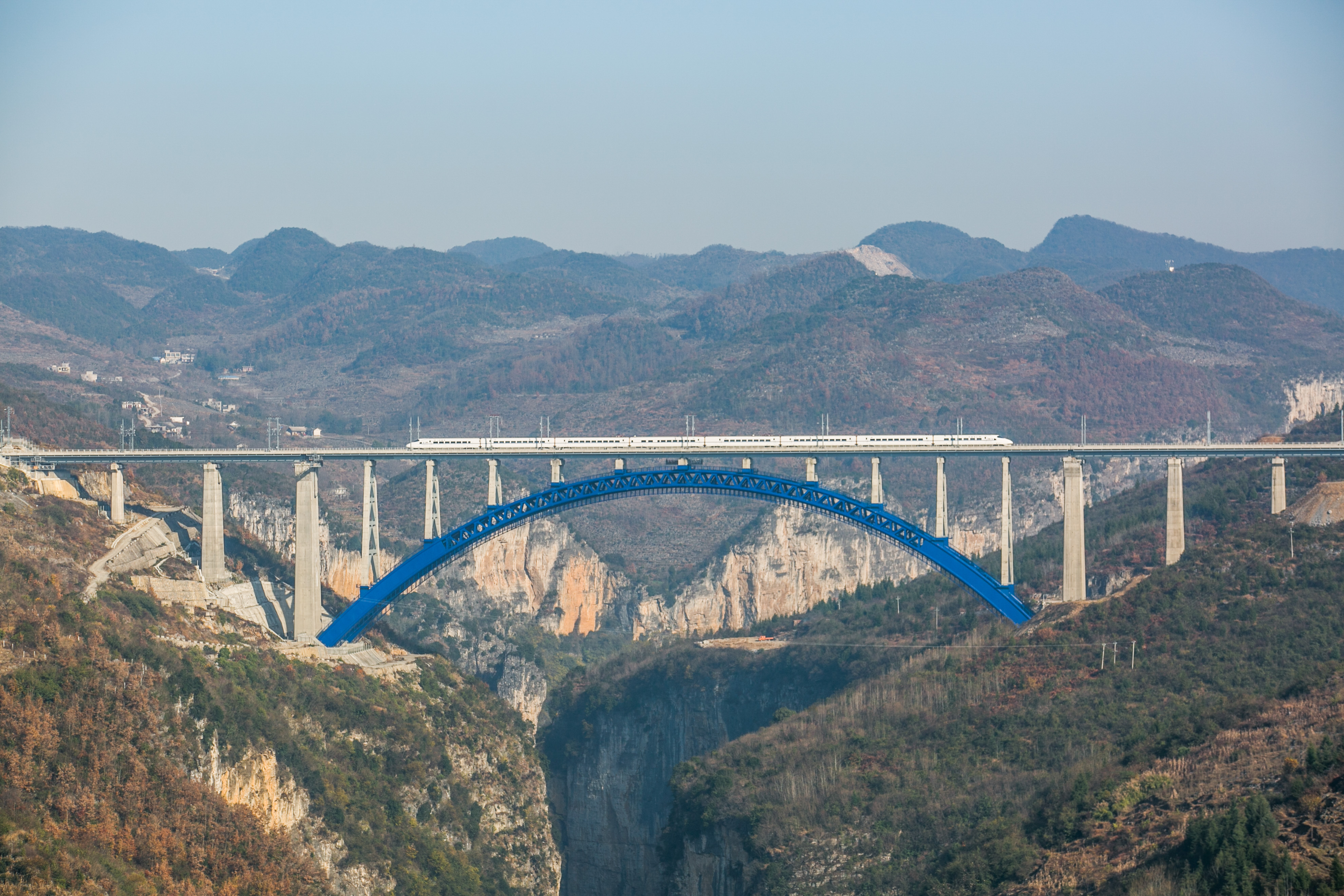 Aerial photo taken on Dec. 16, 2019 shows a bullet train running on the Xixi River grand bridge of the Chengdu-Guiyang railway in southwest China's Guizhou Province. (Xinhua/Yang Wenbin)