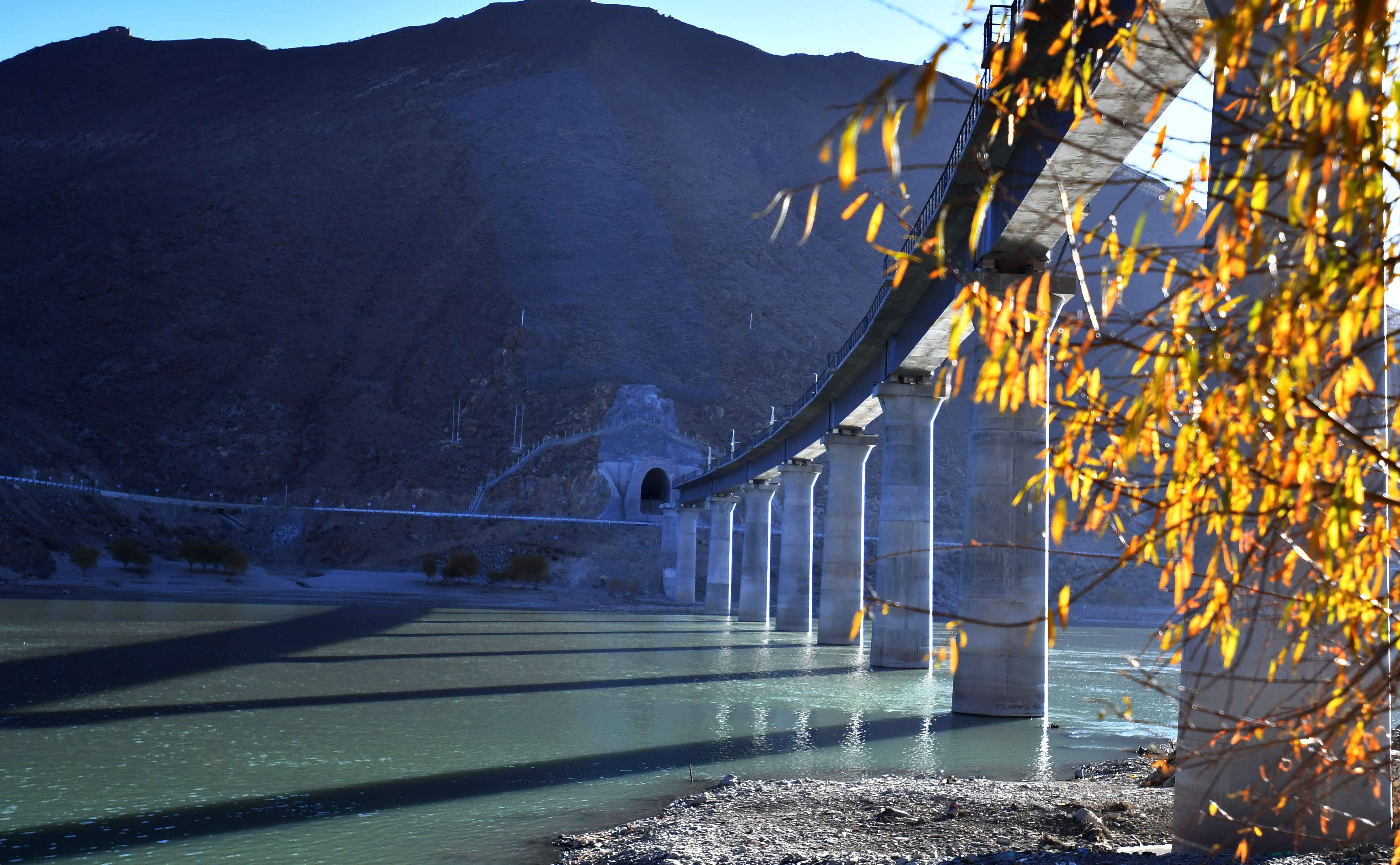 Photo taken on Dec. 1, 2019 shows a bridge above the Yarlung Zangbo River of Lhasa-Nyingchi railway in Sangri County of Shannan, southwest China's Tibet Autonomous Region. (Xinhua/Chogo)