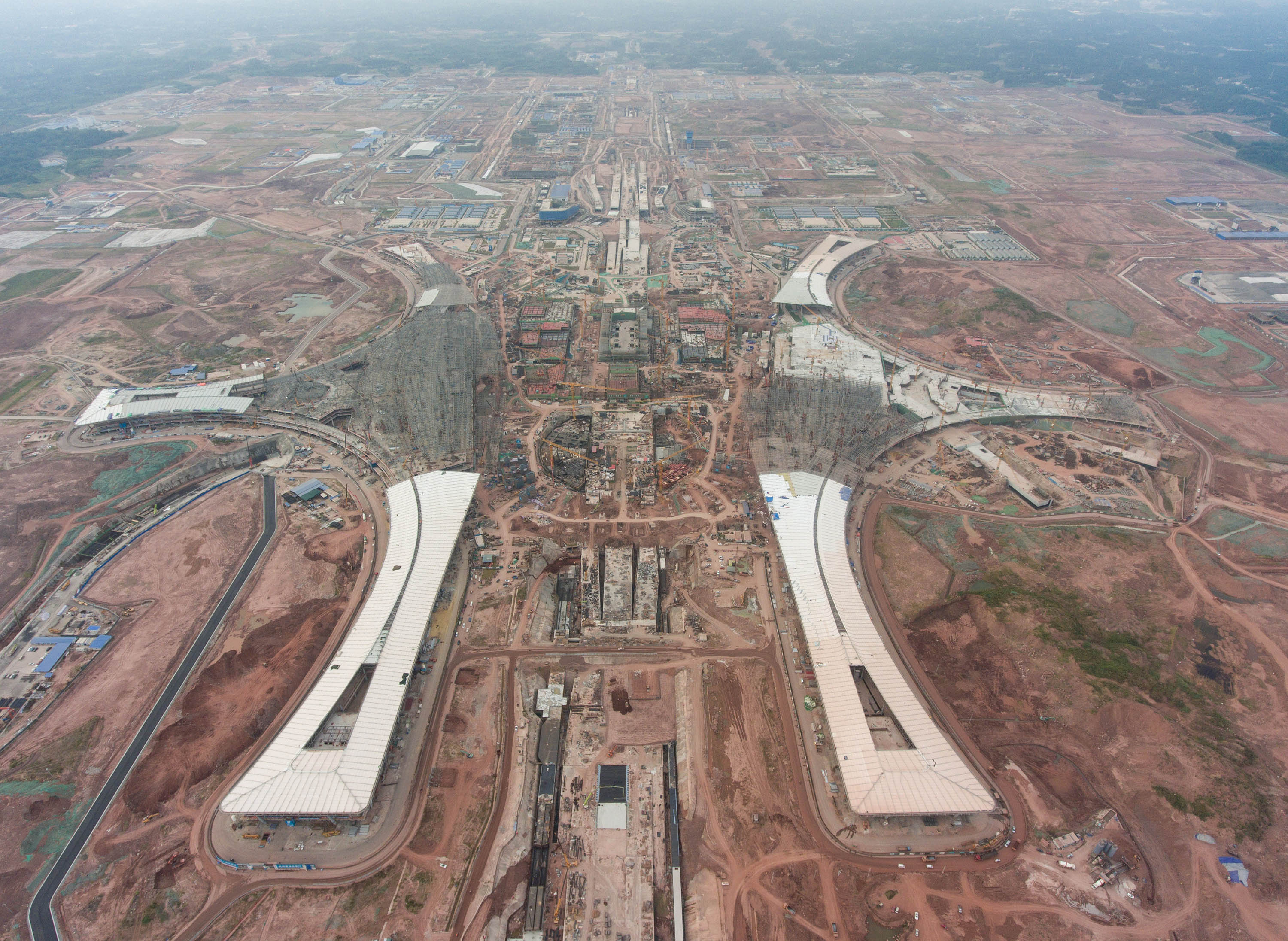 Aerial photo taken on Aug. 27, 2019 shows the construction site of Chengdu Tianfu International Airport in Jianyang, about 50 kilometers from downtown Chengdu, southwest China's Sichuan Province. (Xinhua/Jiang Hongjing)