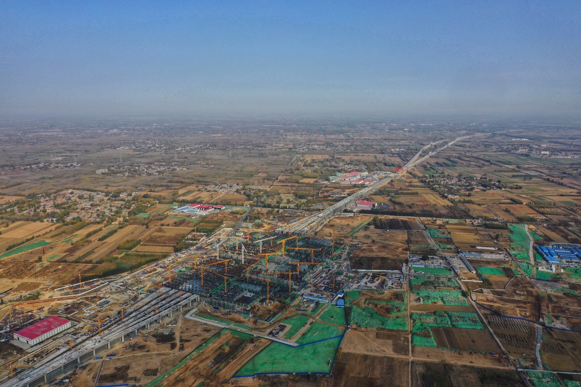 Aerial photo taken on Nov. 7, 2019 shows the Xiongan Station of Beijing-Xiongan inter-city railway under construction in Xiongan New Area, north China's Hebei Province.(Xinhua/Xing Guangli)