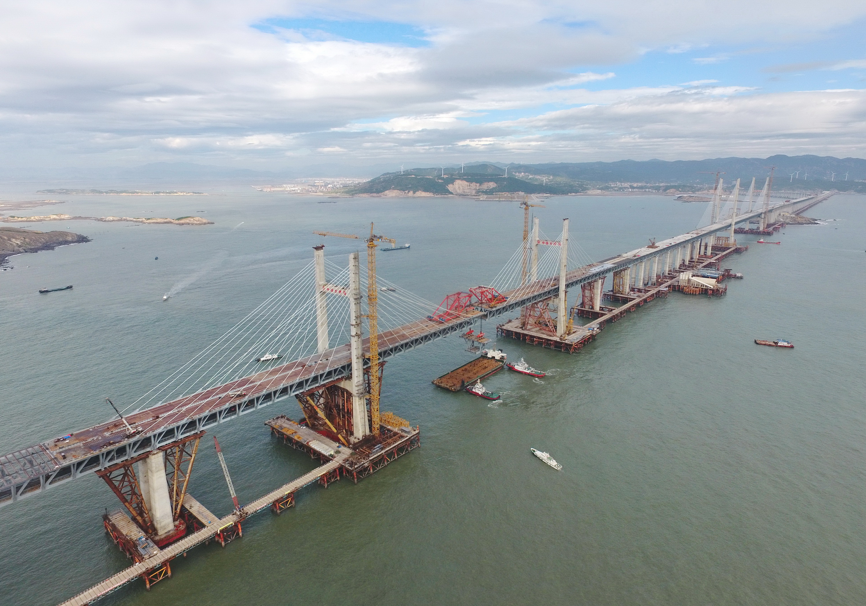 Aerial photo taken on Sept. 21, 2019 shows a steel girder being lifted by a crane at the construction site of the Pingtan Strait Road-rail Bridge in southeast China's Fujian Province. China on Sept. 25, 2019 completed the main structure of the world's longest cross-sea road-rail bridge in Fujian. (Xinhua/Lin Shanchuan)