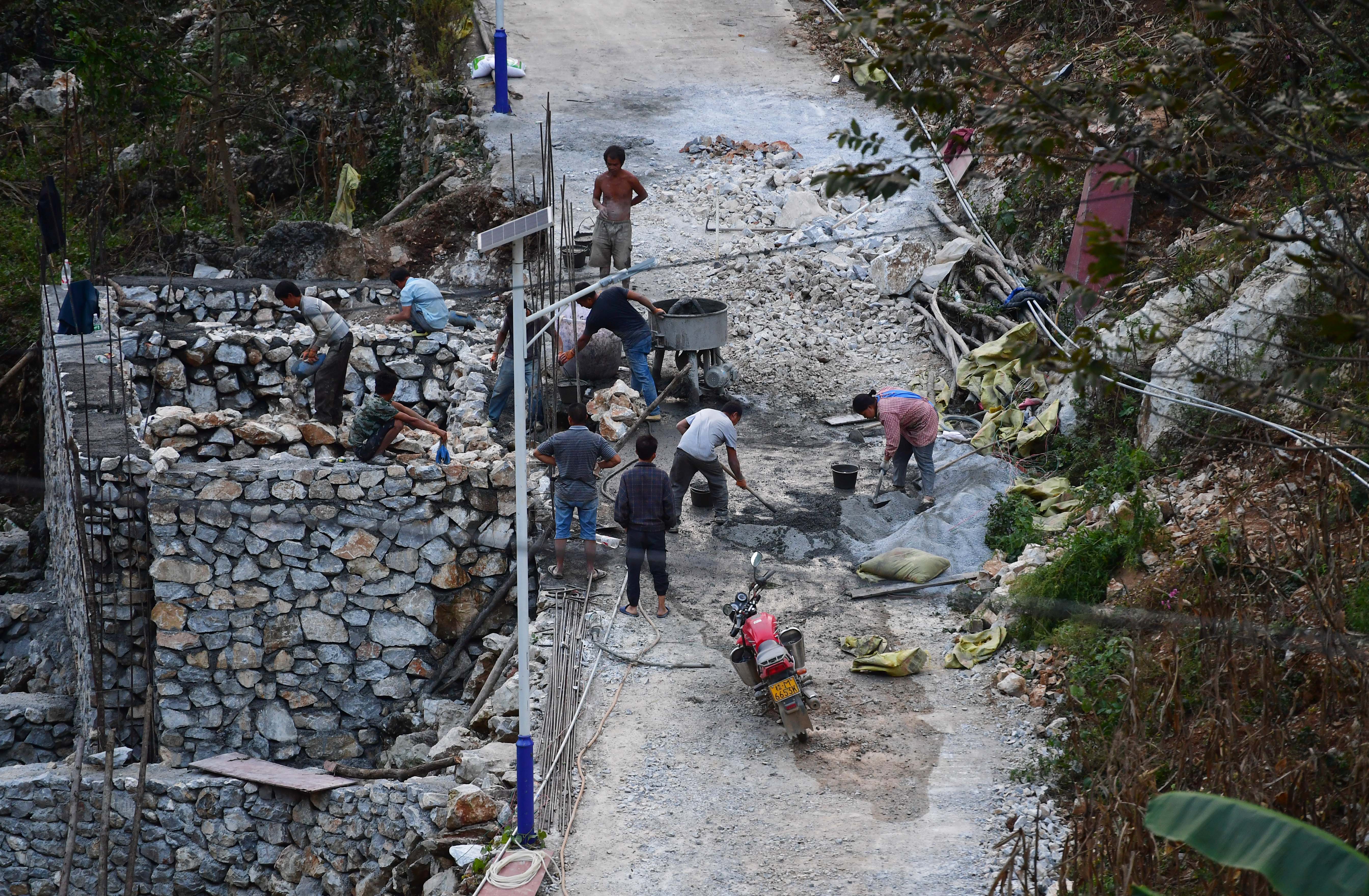 File photo taken on March 9, 2015 shows villagers building new houses with mechanical devices in Nongpingtun of Bahao Village of Dahua Yao Autonomous County, south China's Guangxi Zhuang Autonomous Region. (Xinhua/Huang Xiaobang)