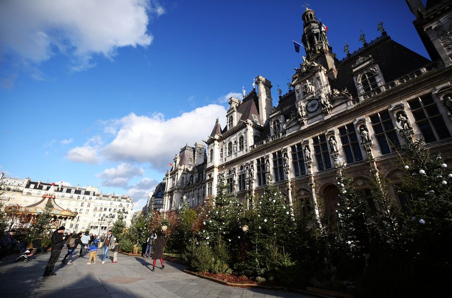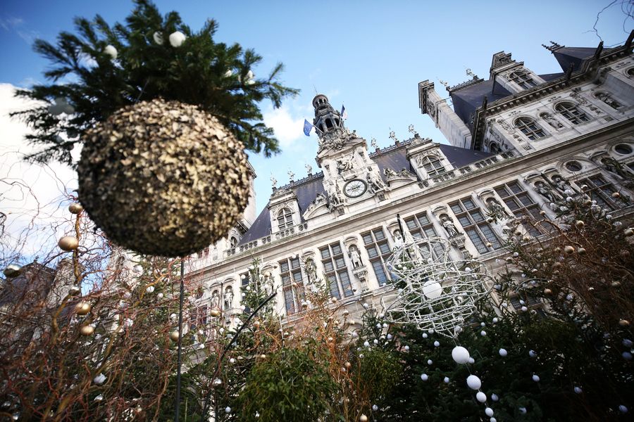 Christmas decorations are seen in front of the City Hall of Paris, France, Dec. 20, 2019. (Xinhua/Gao Jing)