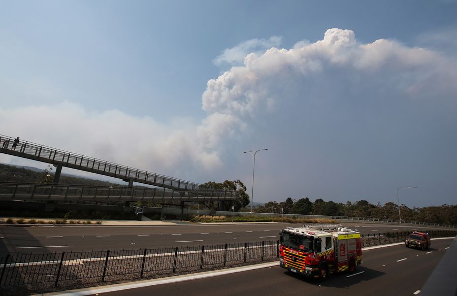 Fire and rescue workers observe the condition of the bushfire in the smoke-shrouded Blue Mountain area, New South Wales, Australia, Dec. 21, 2019. (Xinhua/Bai Xuefei)