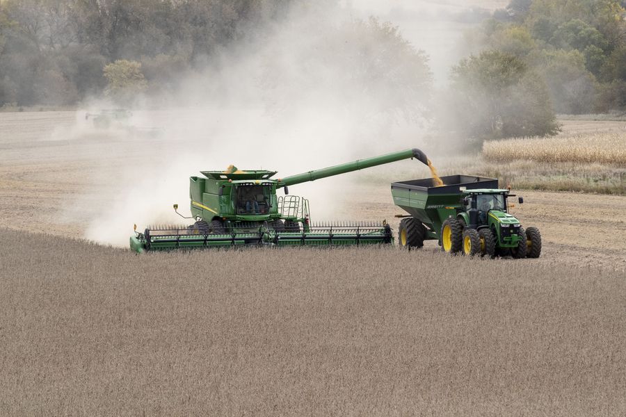A combine and a grain cart work in a soybean field of Pellett family's farm in Atlantic, a small city in Iowa, the United States, Oct. 16, 2019. (Xinhua/Wang Ying)