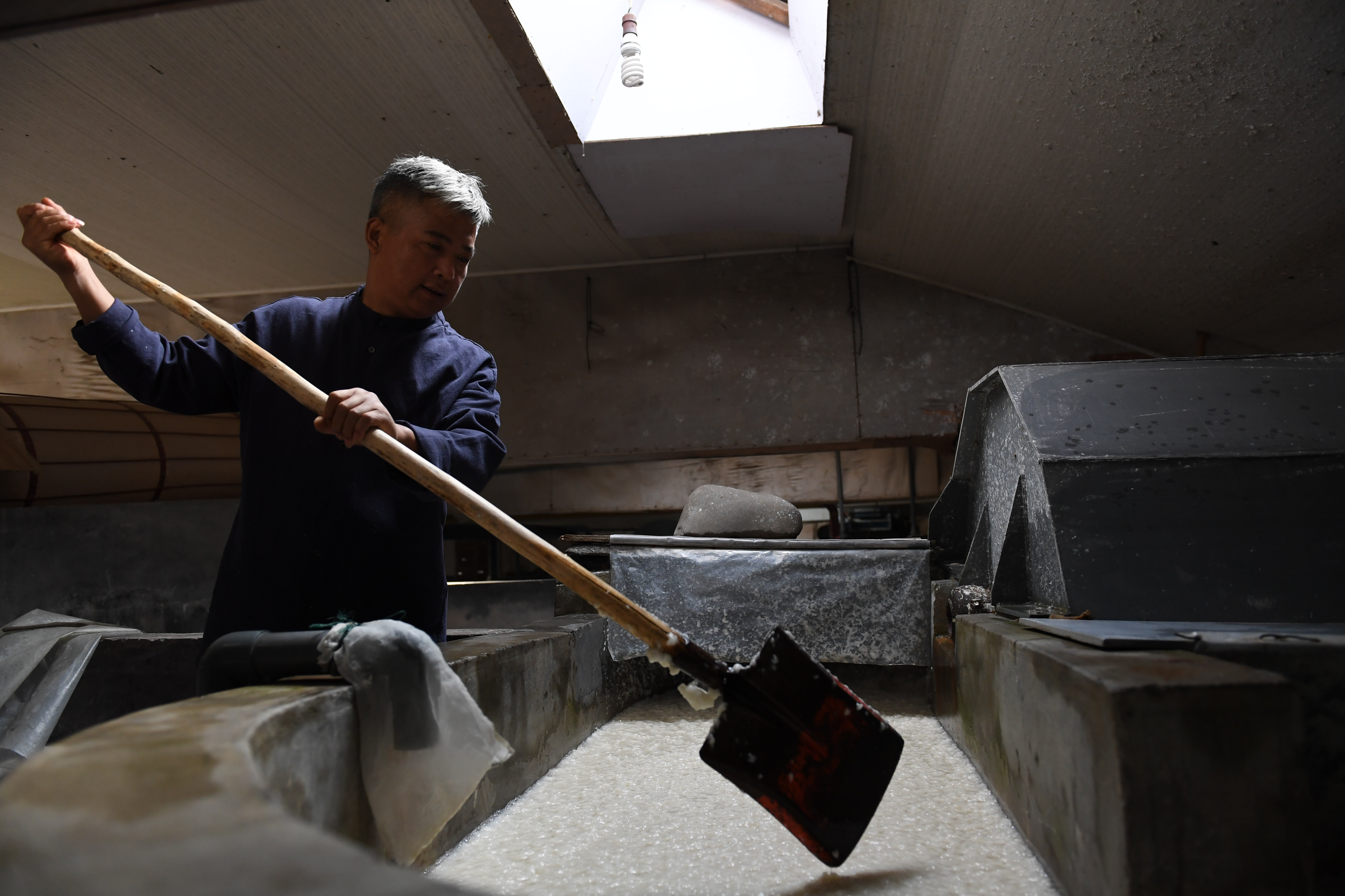 Cao Jianqin makes Xuan paper at the Zijinlou Xuan paper factory in Jingxian County, Xuancheng City of east China's Anhui Province, Oct. 22, 2019.(Xinhua/Liu Junxi)