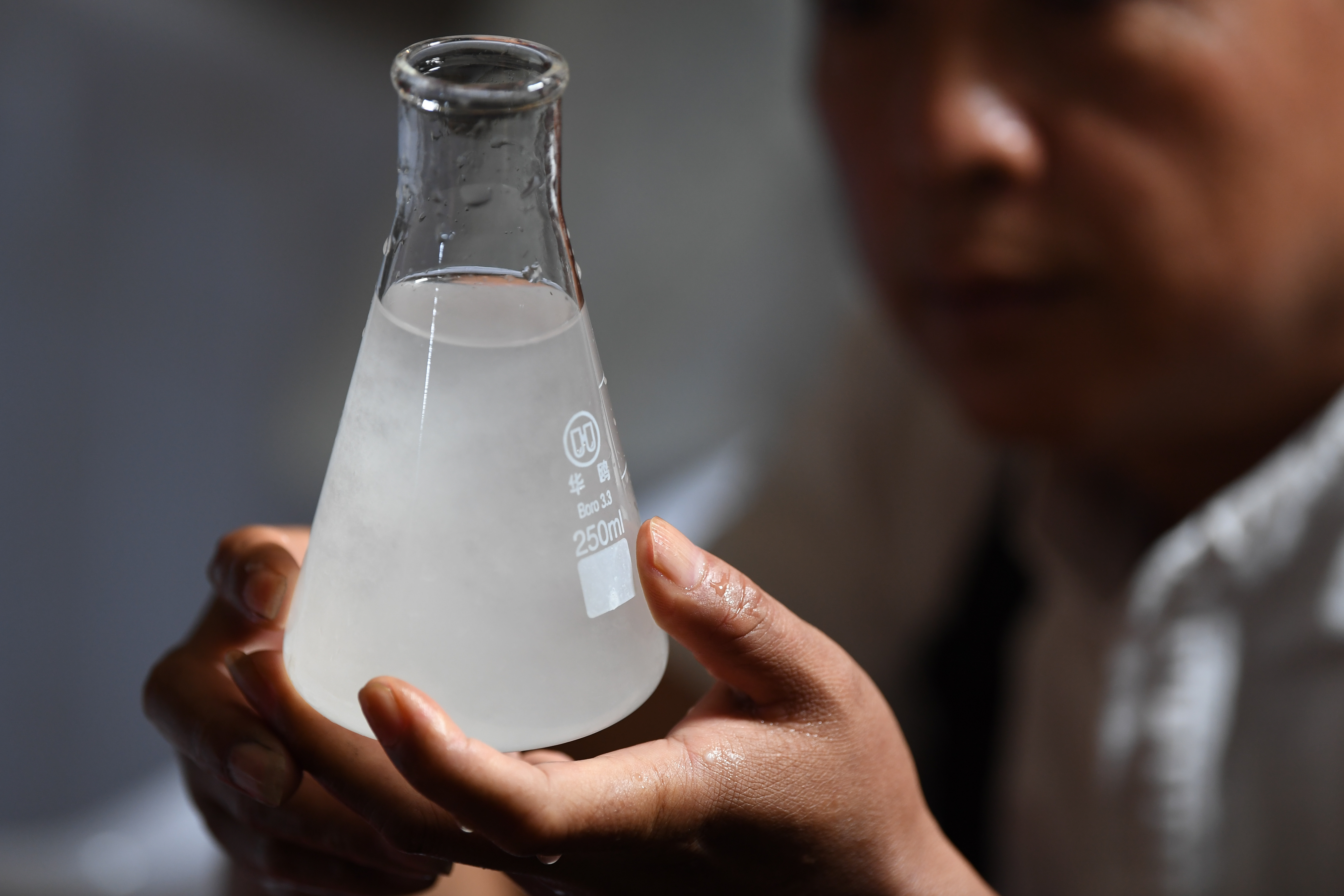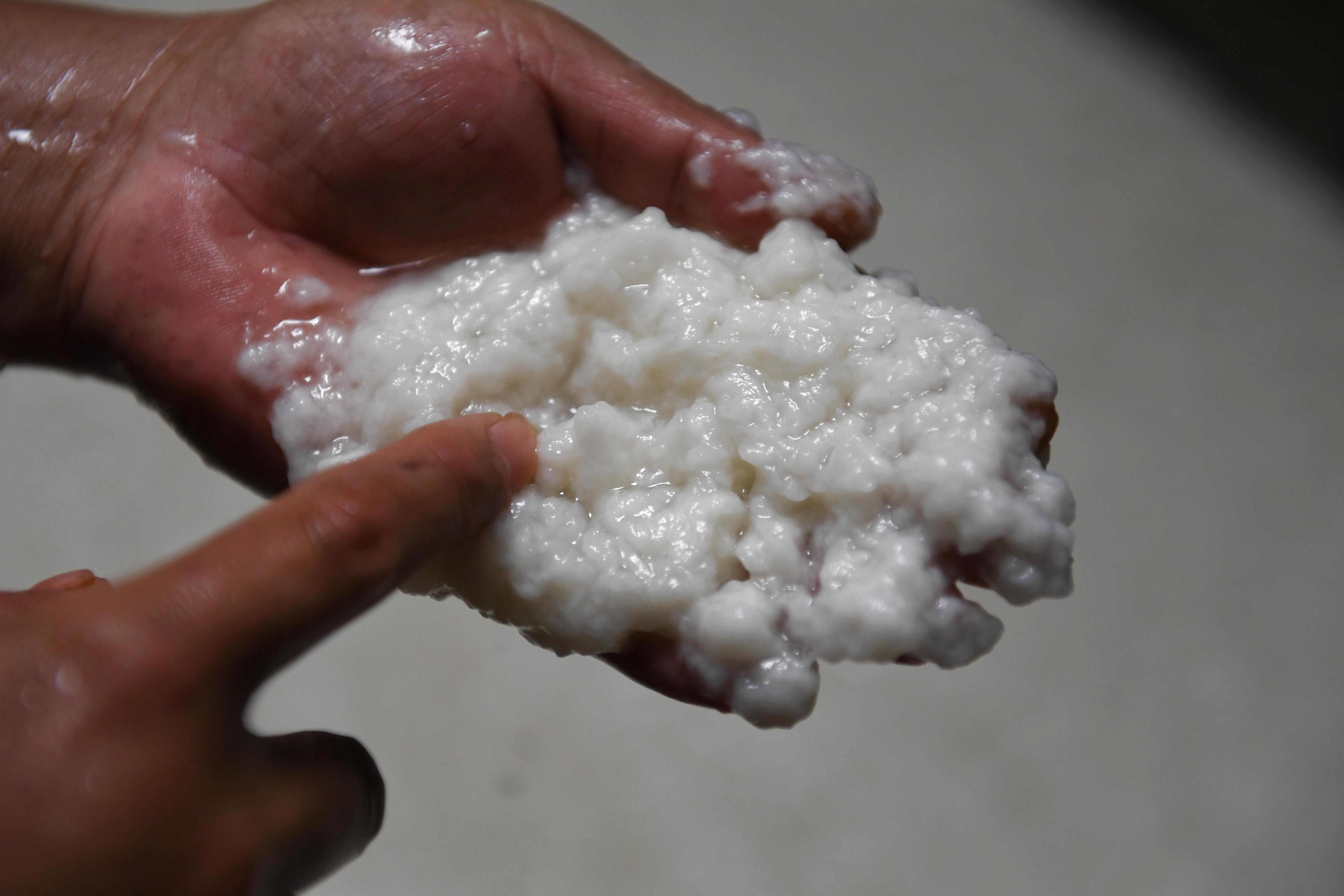 Cao Jianqin checks the quality of pulp to make Xuan paper at the Zijinlou Xuan paper factory in Jingxian County, Xuancheng City of east China's Anhui Province, Oct. 22, 2019. (Xinhua/Liu Junxi)