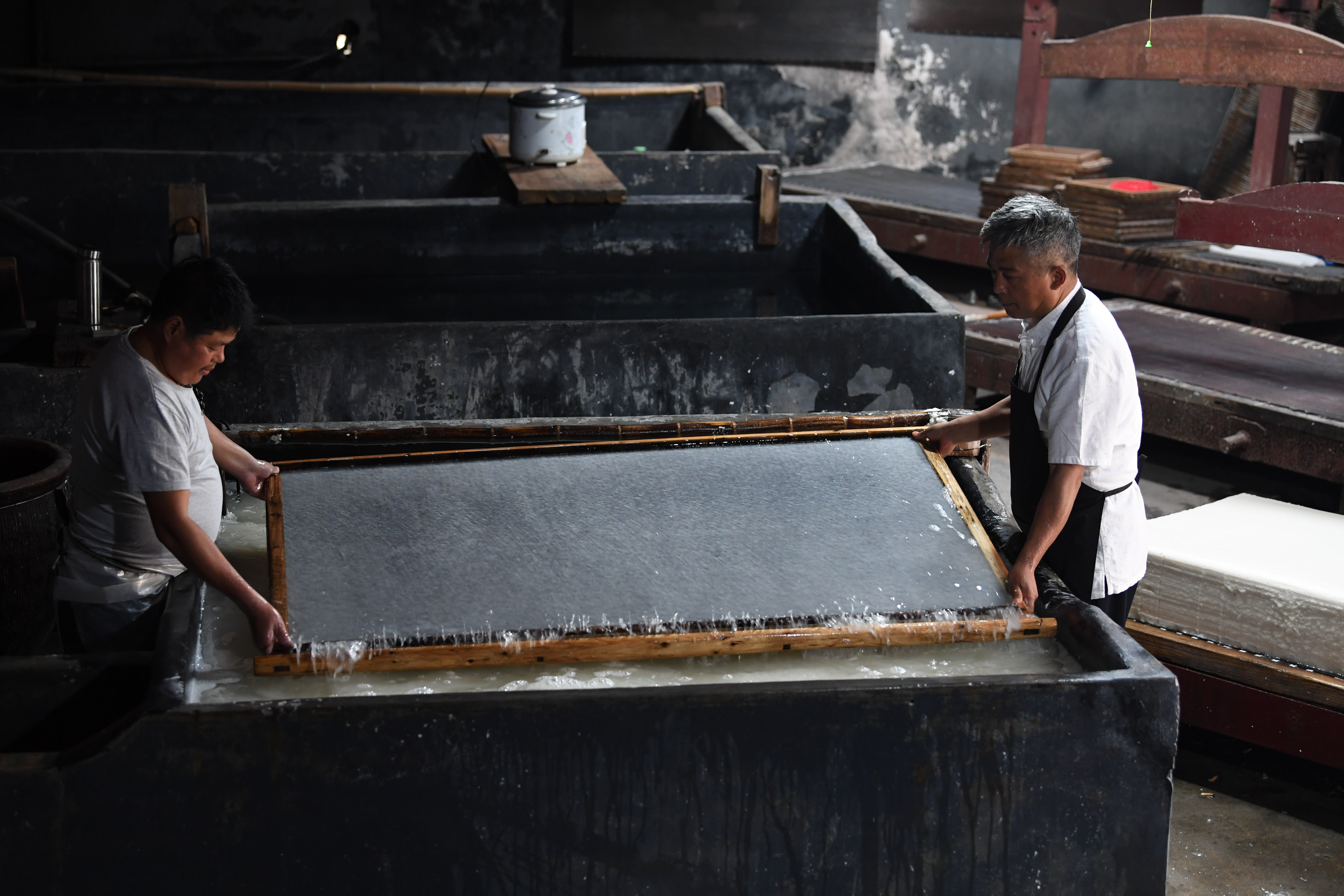 Cao Jianqin (R) makes Xuan paper at the Zijinlou Xuan paper factory in Jingxian County, Xuancheng City of east China's Anhui Province, Oct. 22, 2019. (Xinhua/Liu Junxi)