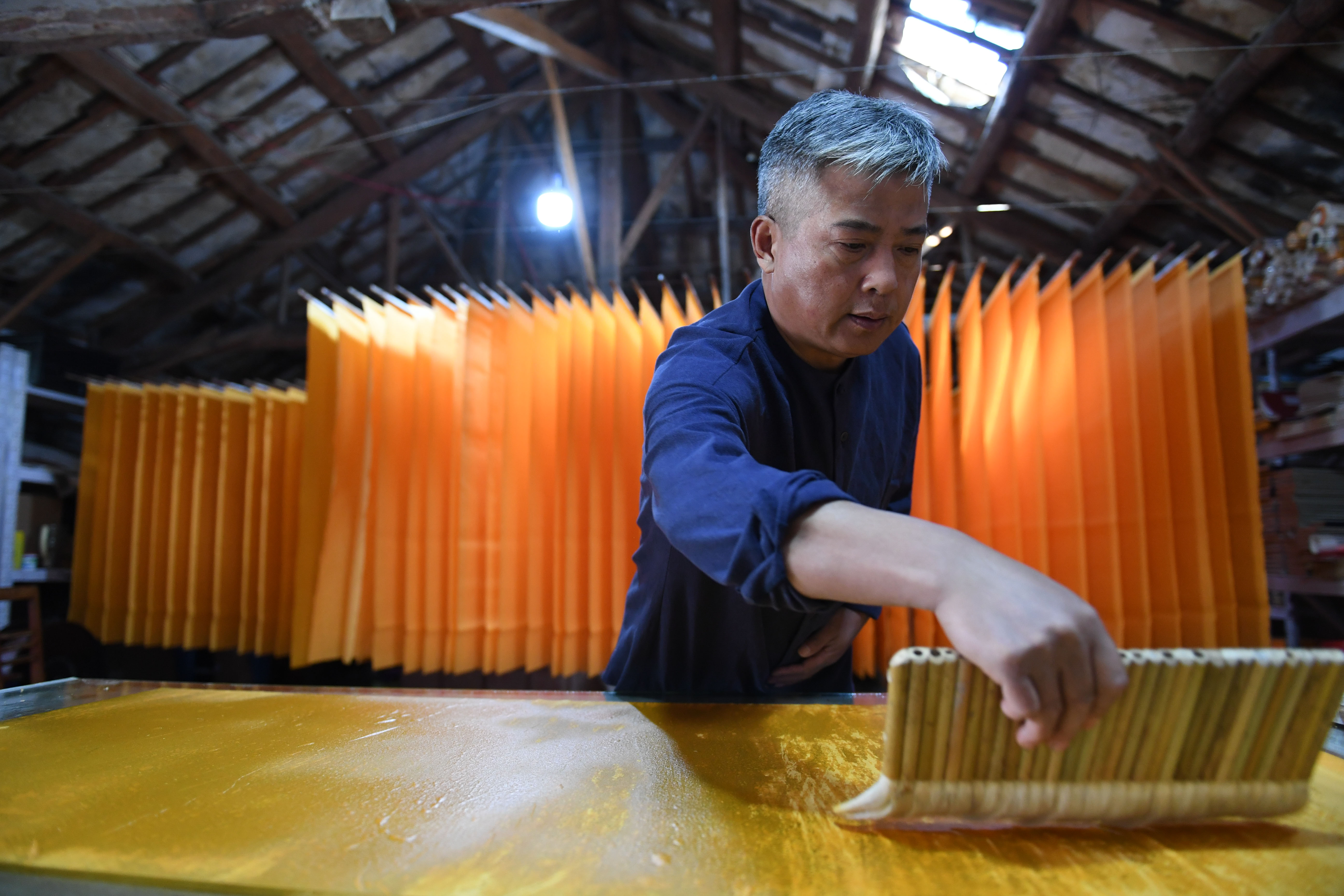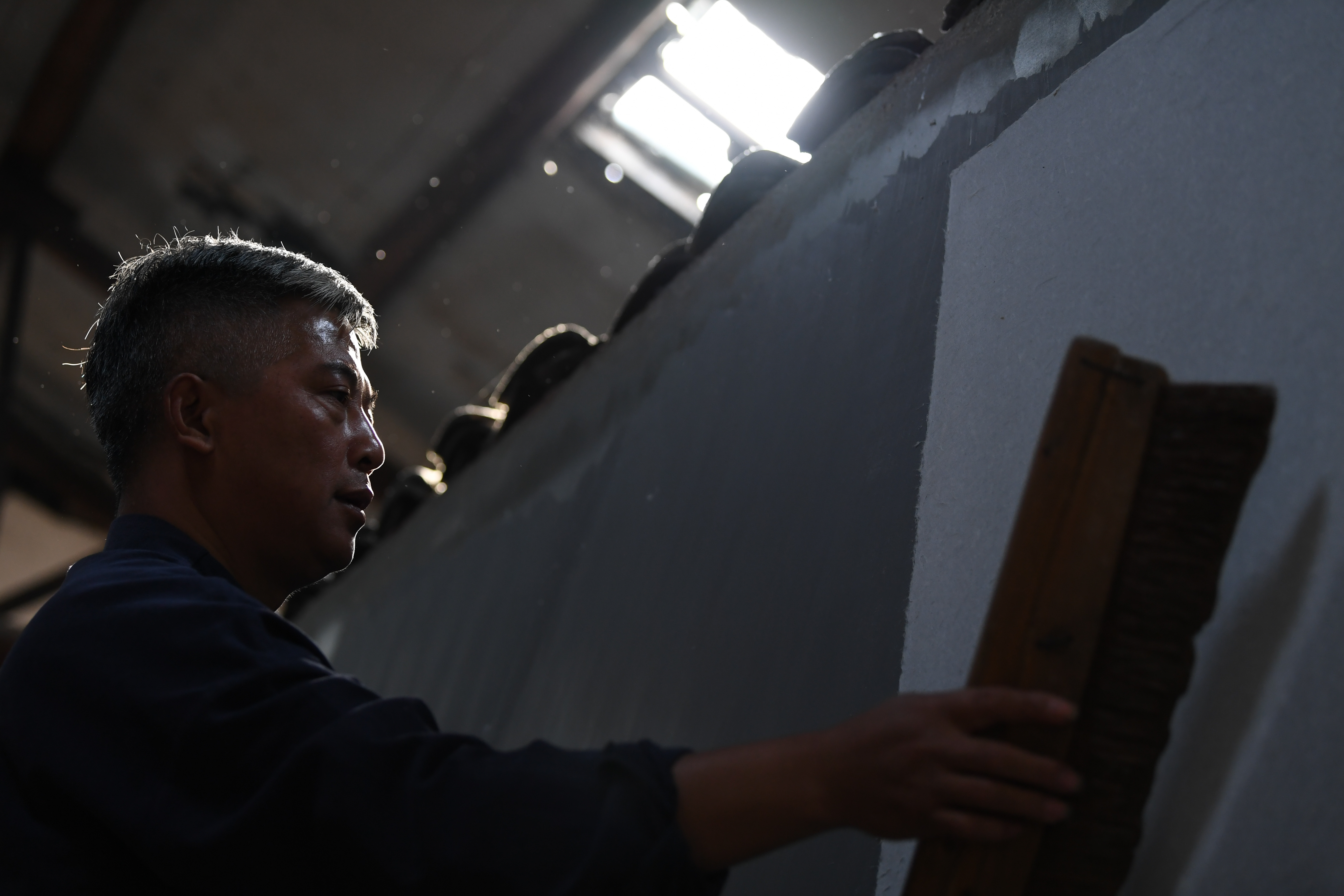 Cao Jianqin dries Xuan paper at the Zijinlou Xuan paper factory in Jingxian County, Xuancheng City of east China's Anhui Province, Oct. 22, 2019. (Xinhua/Liu Junxi)