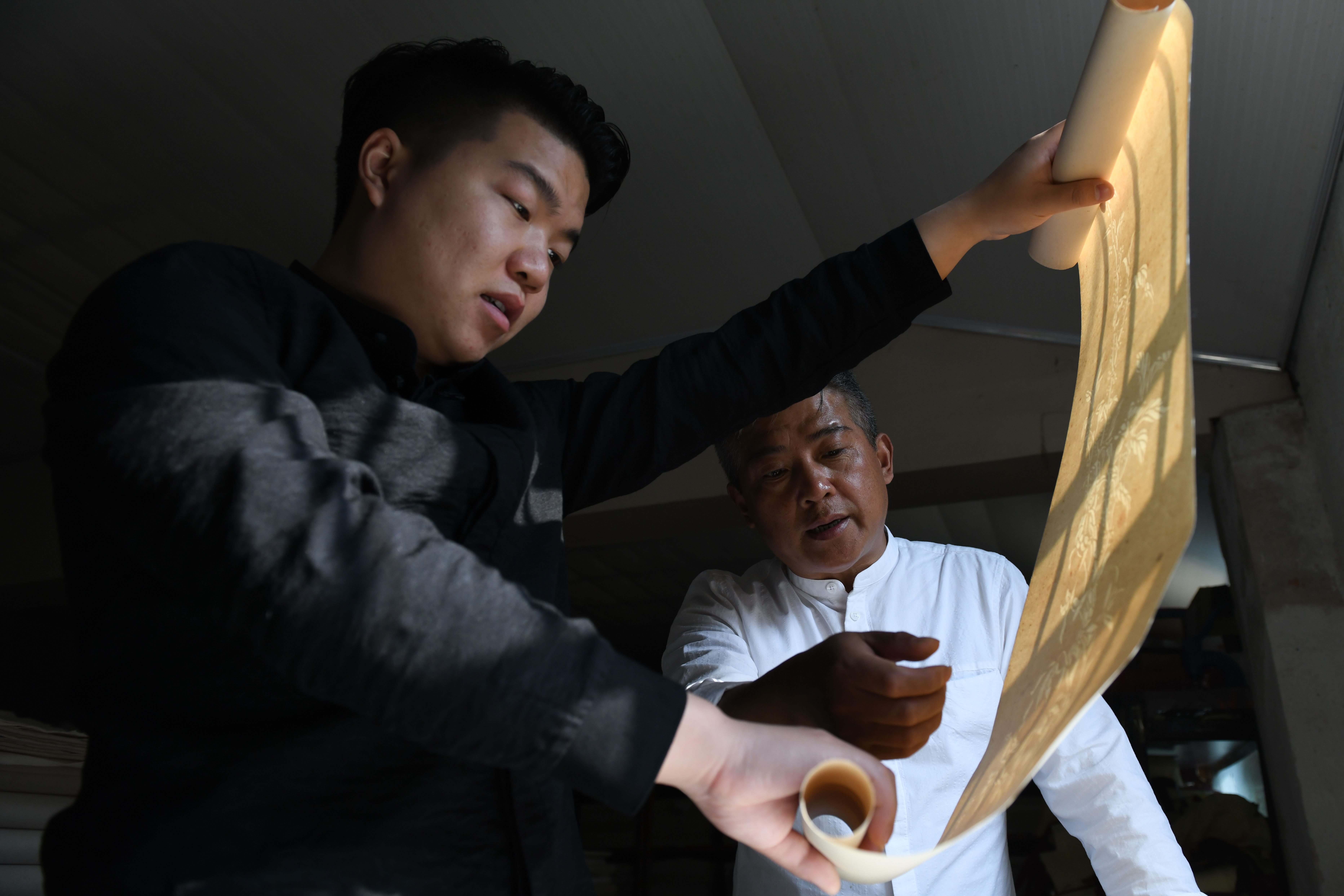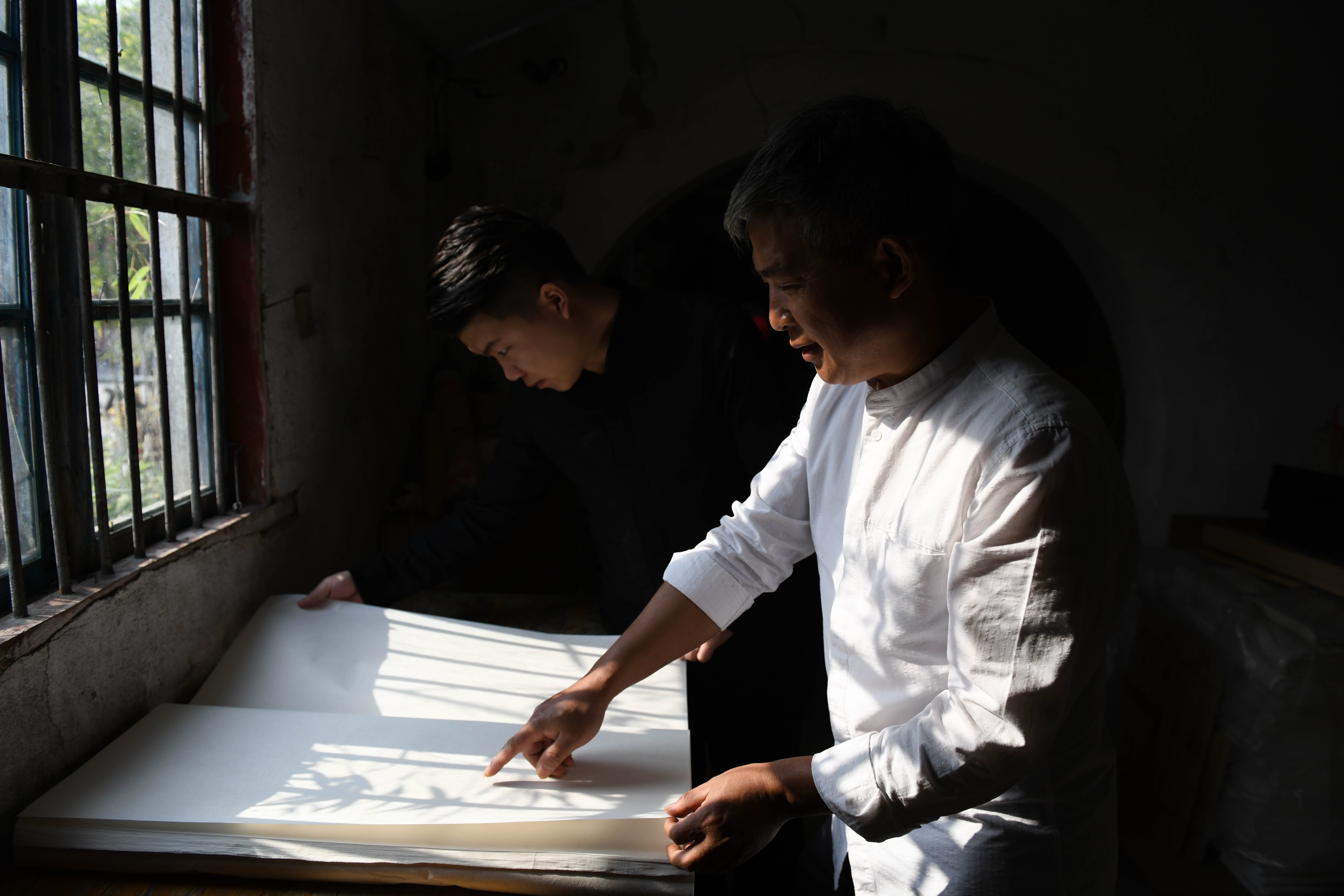 Cao Jianqin (R) and his son Cao Li watch Xuan paper made with craft passed down from their ancestors at the Zijinlou Xuan paper factory in Jingxian County, Xuancheng City of east China's Anhui Province, Nov. 8, 2019. (Xinhua/Liu Junxi)
