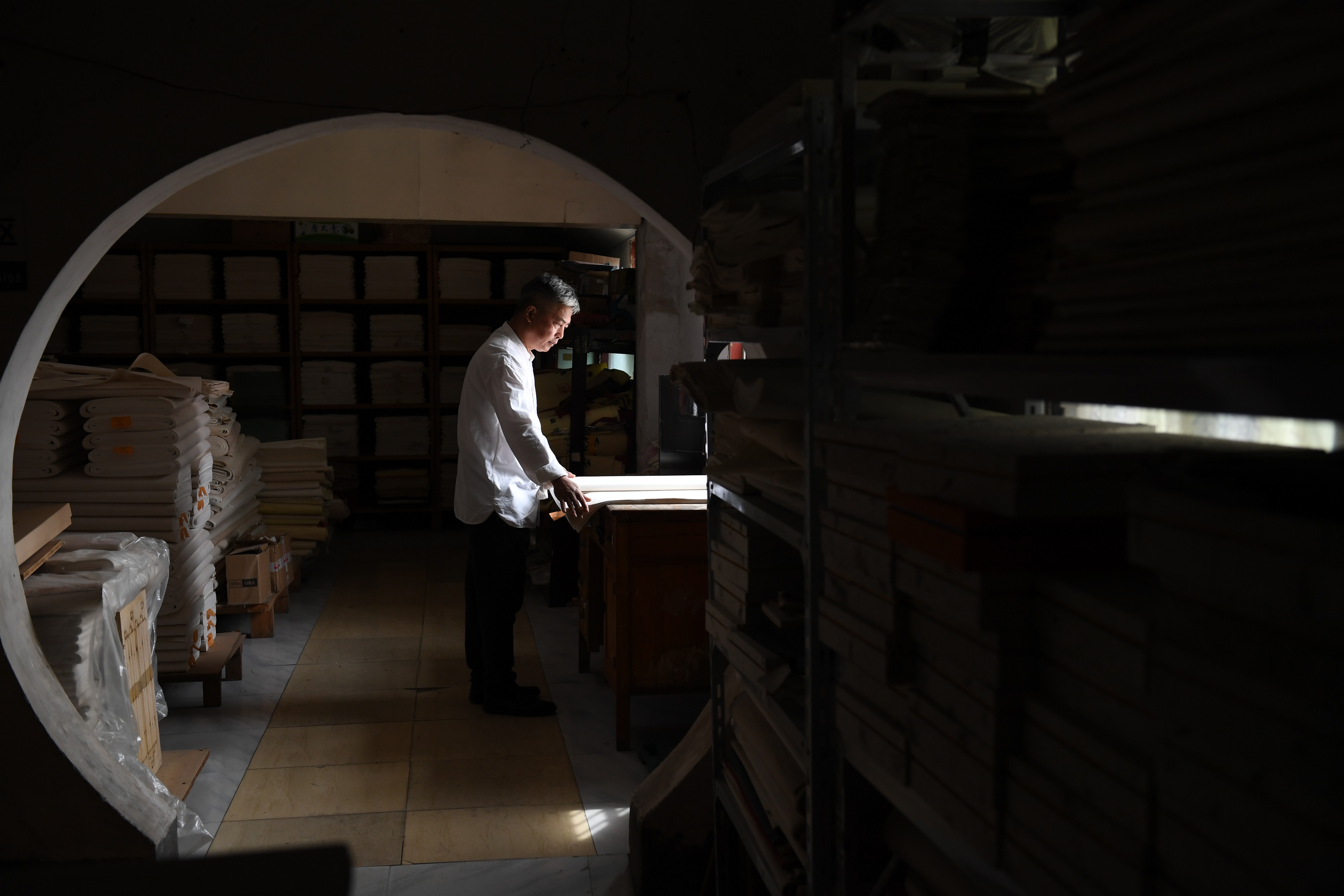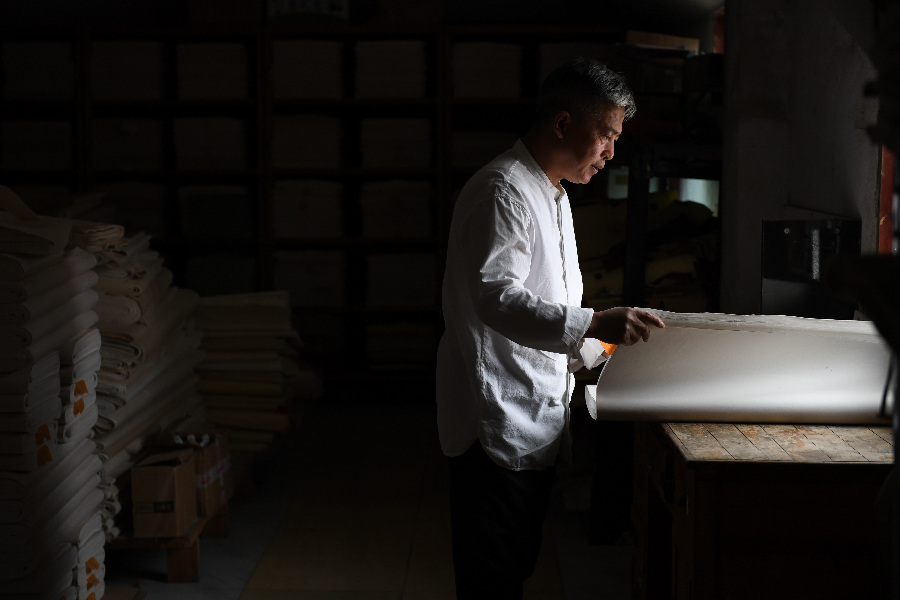 Cao Jianqin checks the quality of Xuan paper at the Zijinlou Xuan paper factory in Jingxian County, Xuancheng City of east China's Anhui Province, Oct. 22, 2019.(Xinhua/Liu Junxi)